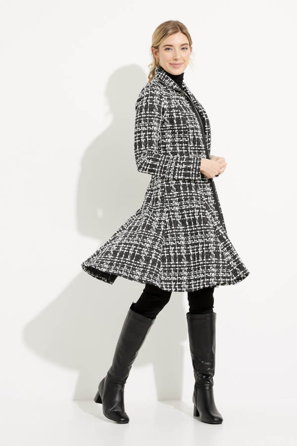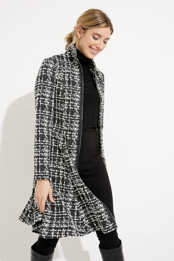 Designed with a mid-thigh length hem, this Joseph Ribkoff jacket exudes drama. It boasts a fitted bodice that flares out, giving you a playfully feminine layer to pile on top of your favourite fall ensemble. Its high collar only adds to the charisma, making this a choice to wear when you're looking to make a serious style statement.