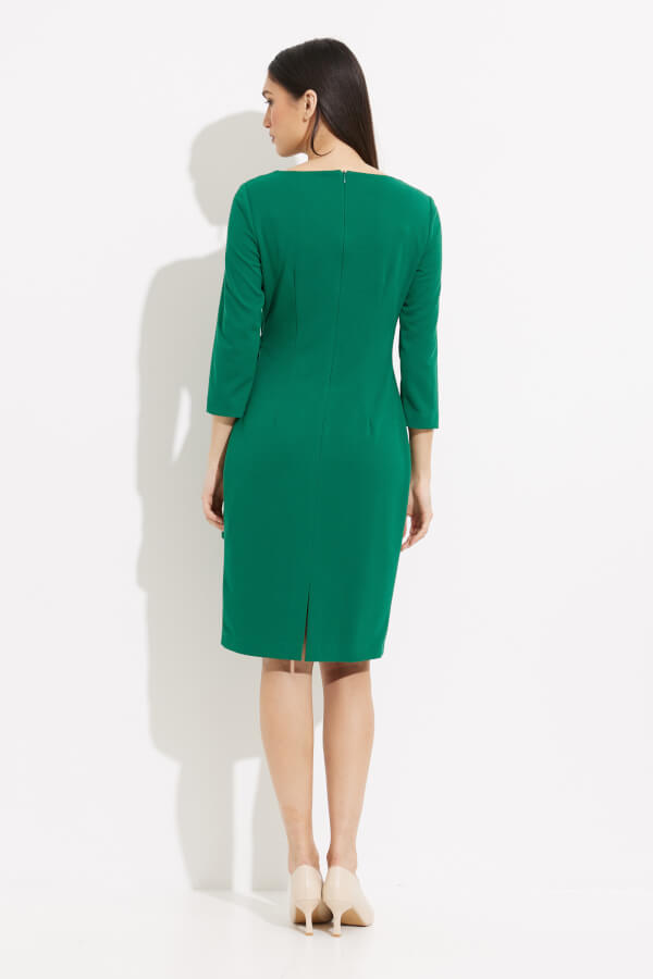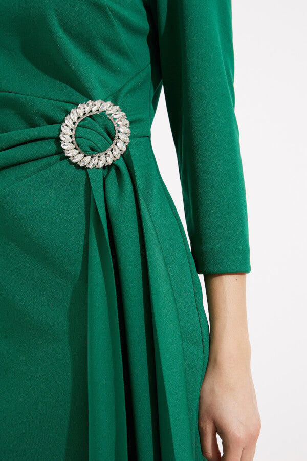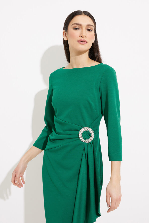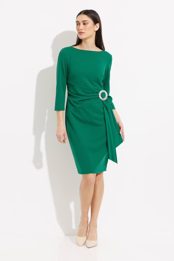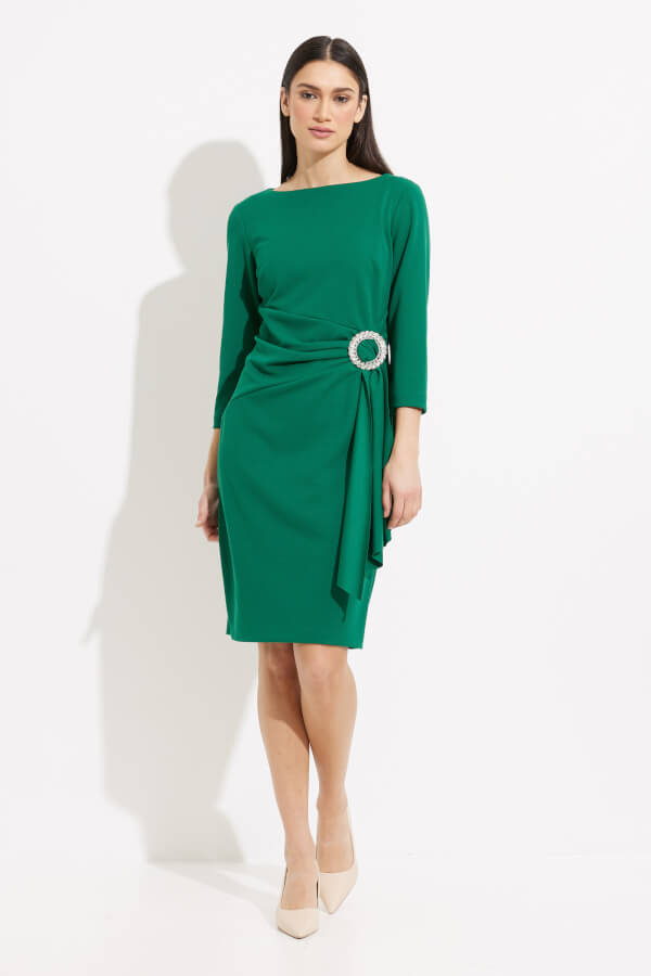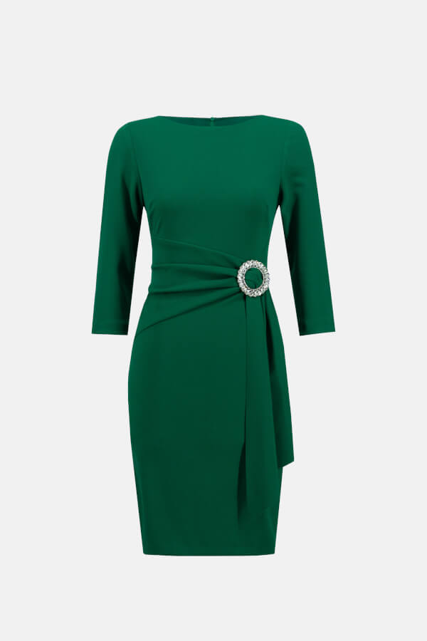 Nothing says "night out" better than rhinestones. This Joseph Ribkoff style is understated yet undeniably elegant, featuring a self-belt that gathers with a rhinestone buckle. A sash drapes elegantly in front, creating a touch of sway with every step. The look is completed with an above-the-knee hemline and boat neck.