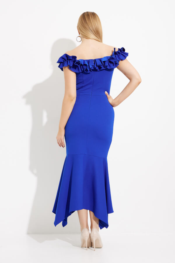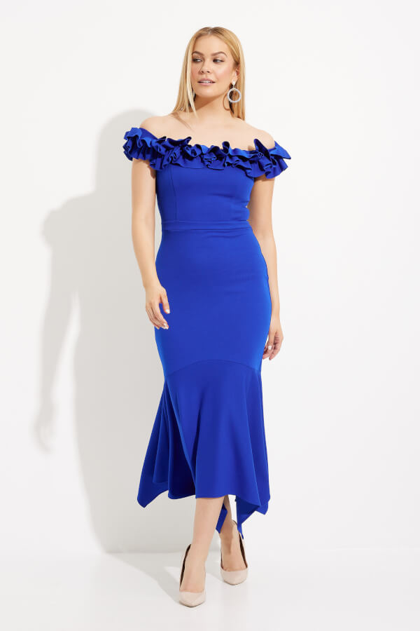 Flaunt those shoulders, beautiful! It's bound to be an all-eyes-on-you affair in this Joseph Ribkoff dress, a style that's fitted through the bodice and cascades into a flowy hem. The focal feature of this gown is its shoulder detailing, featuring bold ruffles that feels reminiscient of a style a Flamenco dancer might wear. Eye-catching and elegant, your next evening occasion needs a style like this.