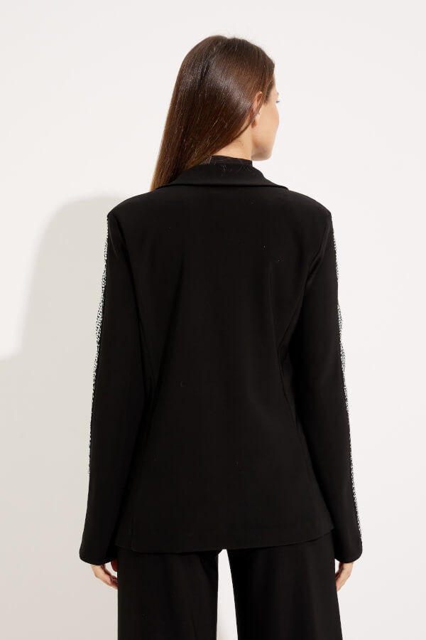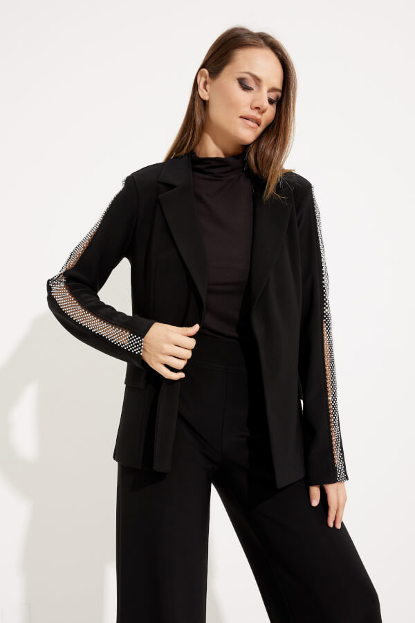 This sleek and stylish blazer will instantly elevate any outfit. The bonded silky knit fabric is soft and luxurious, and the single rhinestone button adds a touch of glamour. The clear rhinestone trim is a unique and eye-catching detail, and the sheer net insert in the center of the long sleeves adds an extra touch of sophistication. Shoulder pads add shape to this evening-ready blazer. Part of the Signature collection.