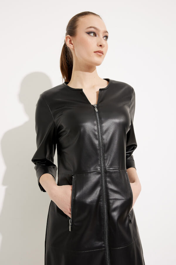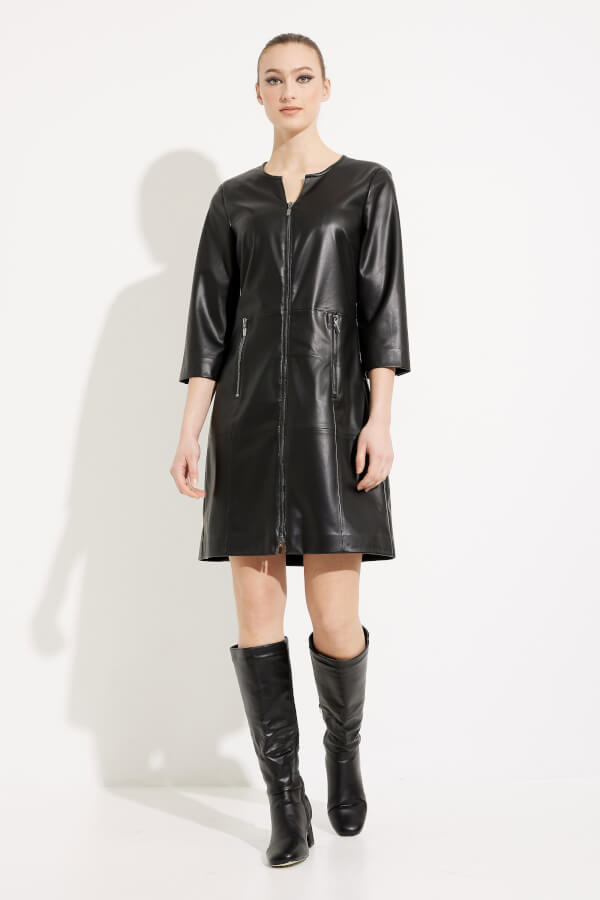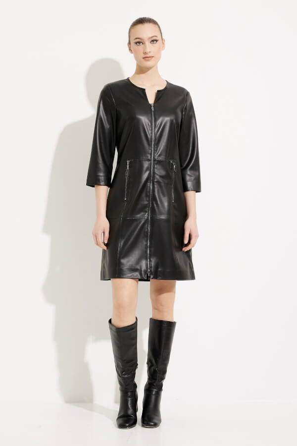 With its fitted silhouette and edgy zipper details, this Joseph Ribkoff dress is a statement look. Seam detailing adds structure while the rounded neckline softens the angular lines found here. The ideal dress for any corporate event or post-work cocktail hour.