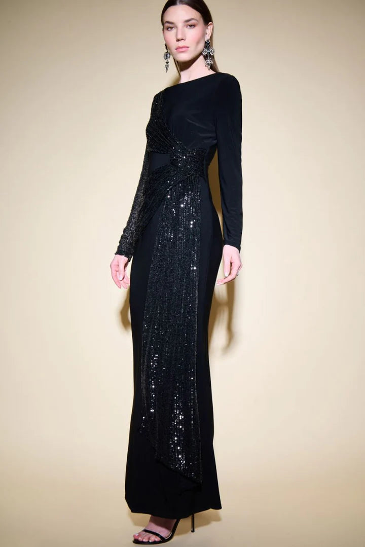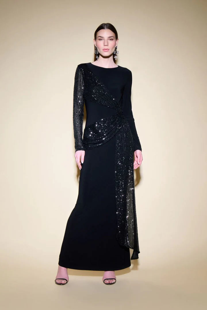 This figure-flattering fit-and-flare maxi dress is anything but basic. The draping and cascade panels at the front add volume and elegance to this sequined beauty. Long sleeves and a crew neck frame the dress. Wear it confidently at your next event with contrasting accessories. Part of the Signature Collection.
