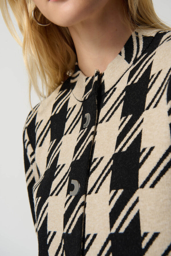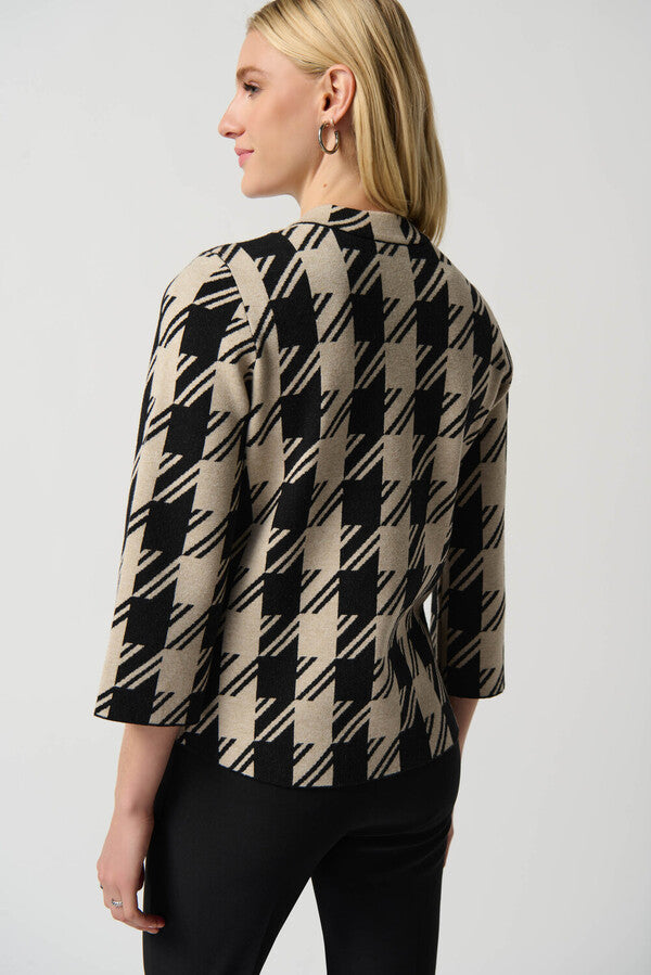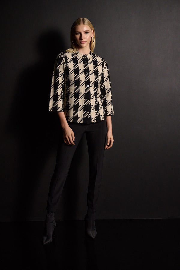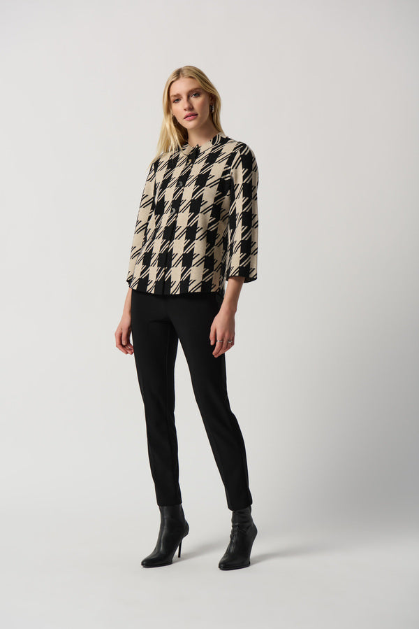Houndstooth is having a moment this season! Joseph Ribkoff takes this trendy print and gives it a modern twist on this boxy jacket — a style that's refined and polished for your work week. A rounded collar and neat buttons complete the look, giving you a beautiful style to layer over a simple blouse, camisole, or tee.