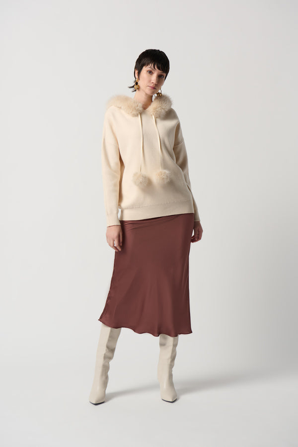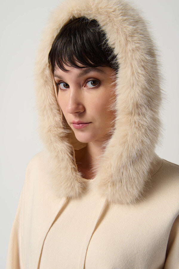 Joseph Ribkoff does the faux fur trend sparingly on this sweater, trimming the hood and drawstring end pieces with the trend to create a fabulously fun casual piece. If you're aiming for a more low-key look, simply take the faux fur off—it's removable! Instead of slipping on a basic hoodie, why not dress up your off-duty outfits in a striking style like this? You'll feel warm and cozy while looking your best!