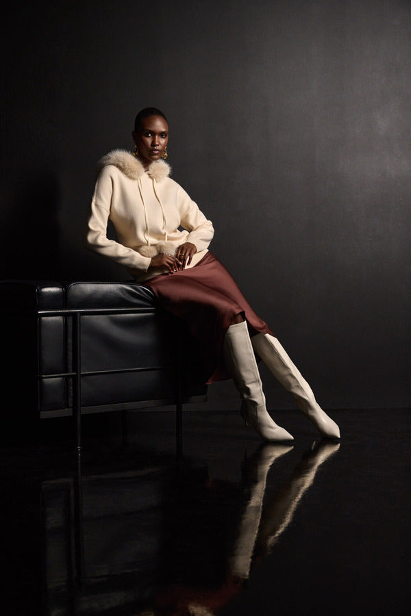 Joseph Ribkoff does the faux fur trend sparingly on this sweater, trimming the hood and drawstring end pieces with the trend to create a fabulously fun casual piece. If you're aiming for a more low-key look, simply take the faux fur off—it's removable! Instead of slipping on a basic hoodie, why not dress up your off-duty outfits in a striking style like this? You'll feel warm and cozy while looking your best!