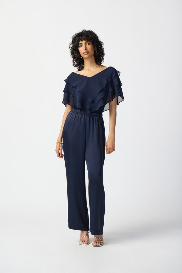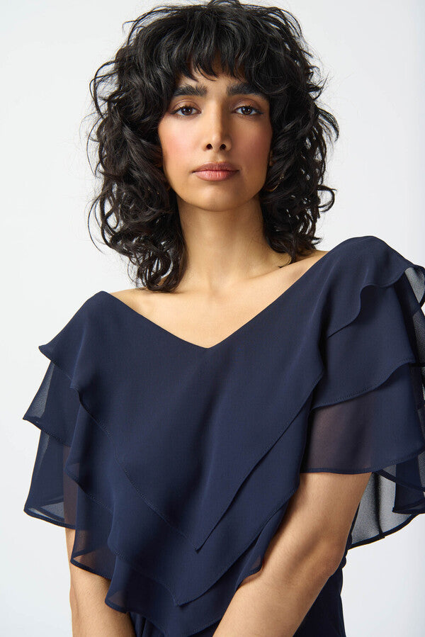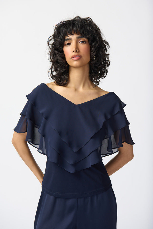 A charming chiffon overlay top from Joseph Ribkoff is just what your evening needs! The neckline is cut into a wide V-neck shape, giving you plenty of room to pile on beautiful necklaces. The rest of the top is covered in ruffled chiffon tiers, which add movement to your look. Because the top is so voluminous, it would pair beautifully with a straight leg bottom like a pant or pencil skirt.