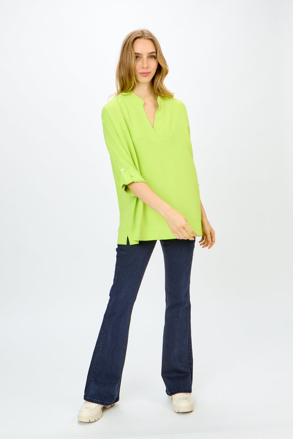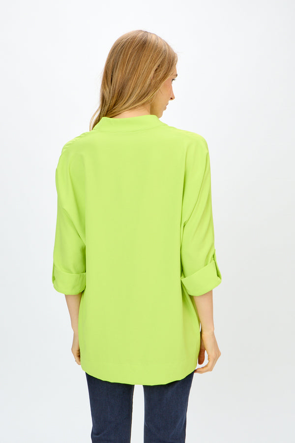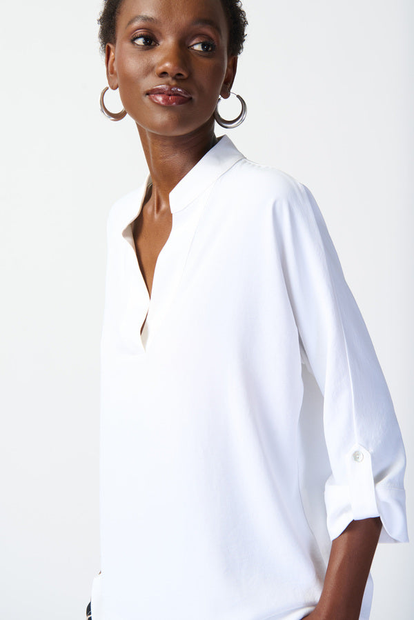 With its loose fit and wide collar, this Joseph Ribkoff popover blouse is a sensible choice for warm weather. Rolled tab sleeves add a touch of casual-chic to this elegantly simple look. With a relaxed fit, this easy style pairs well with a printed pant or denim. Your summer styling, solved.