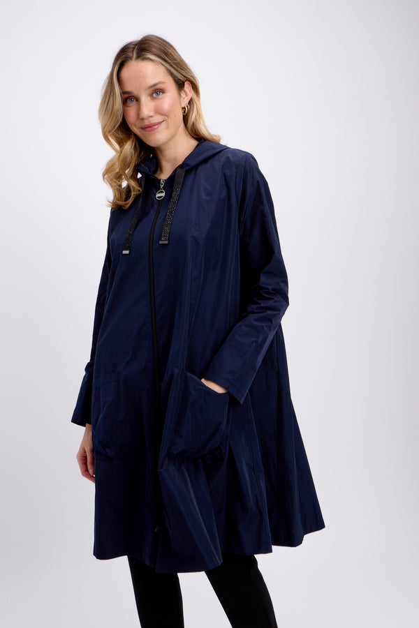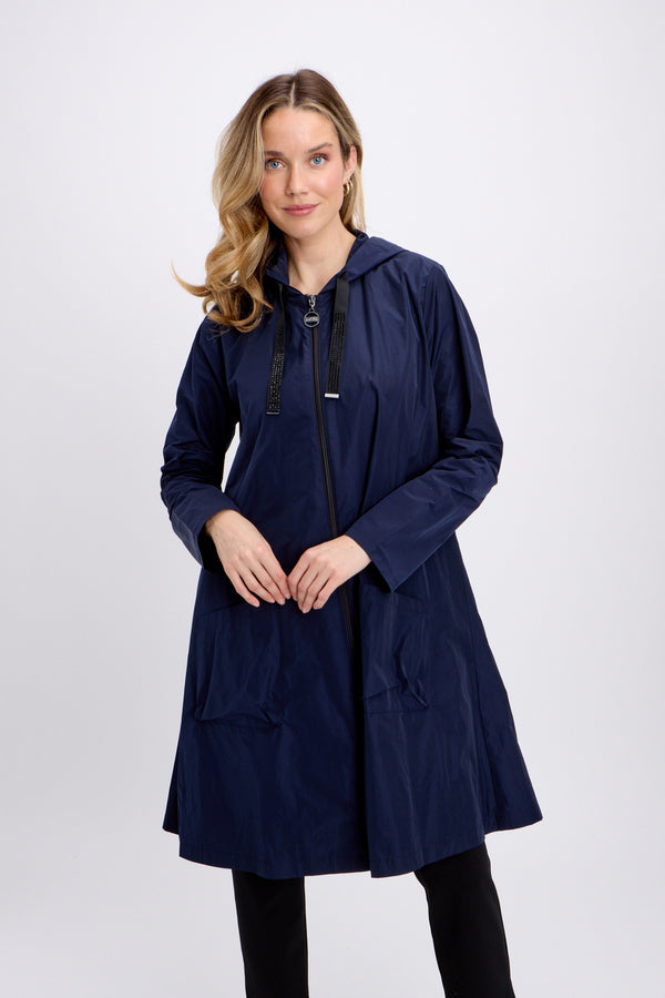 This long coat from Joseph Ribkoff features a flared shape that reaches right down to the knees, keeping you warm and comfortable all at once. In addition to a long zipper for bottom-to-top closure, this back-pleated coat also features a drawstring hood. Convenient and chic is the name of the game.