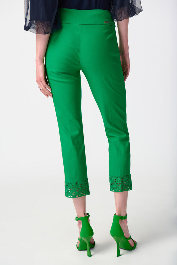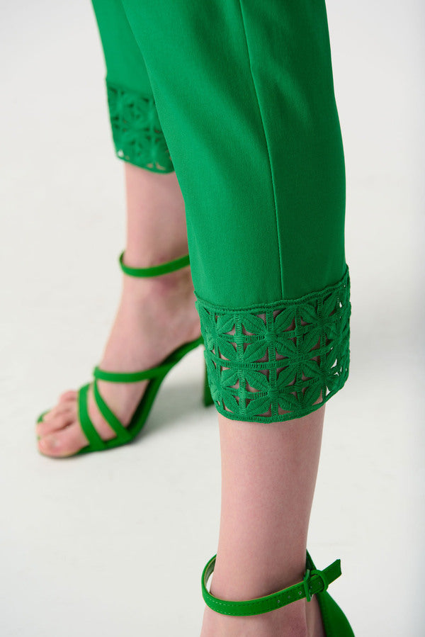Thanks to its form-fitting cut, this Joseph Ribkoff pant can be worn with a crop top or a tunic. A thick, elasticated high waist enhances comfort. The decoration that makes all the difference is at the bottom: delicate, plant-inspired lace adorns the entire lower calf.