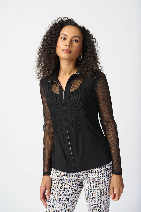 This Joseph Ribkoff cardigan features a full-length zipper at the front, running from the hem to the neckline, giving you the flexibility to customize the opening just the way you want! While its back and mid-sections are solid and opaque, the chest and long sleeves are crafted from delicate fishnet fabric. This unique blend of materials showcases the designer's commitment to creating chic, professional pieces for modern women.