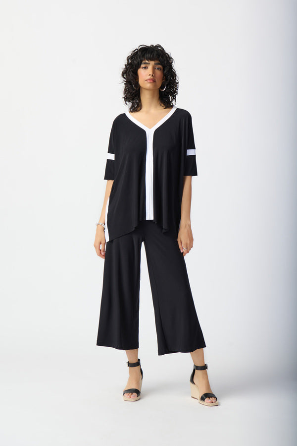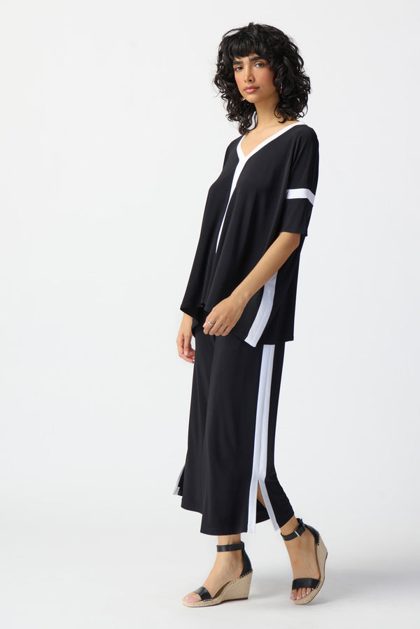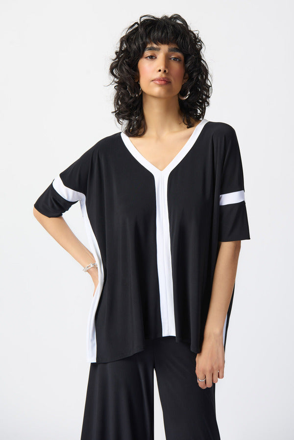 The epitome of casual chic is found here on this two-tone Joseph Ribkoff top. With a roomy body and elegantly sleek sleeves, it effortlessly combines comfort and style. The top features striking contrasting bands along the neckline, creating sleek lines that follow the length of your body and elegantly wrap around your arms. While it boasts a flattering V-neck in the front for a professional touch, the back side keeps it cool, making this a veratile choice suited for any occasion.