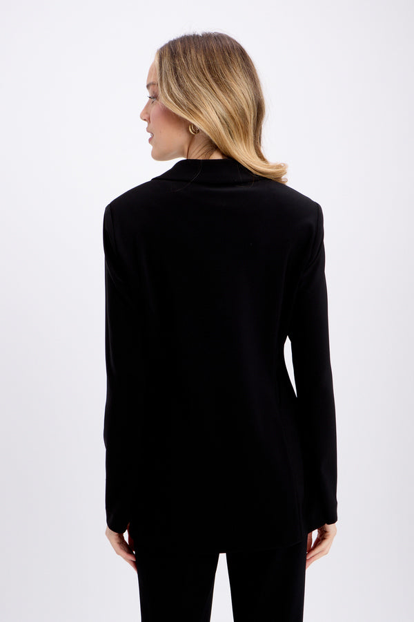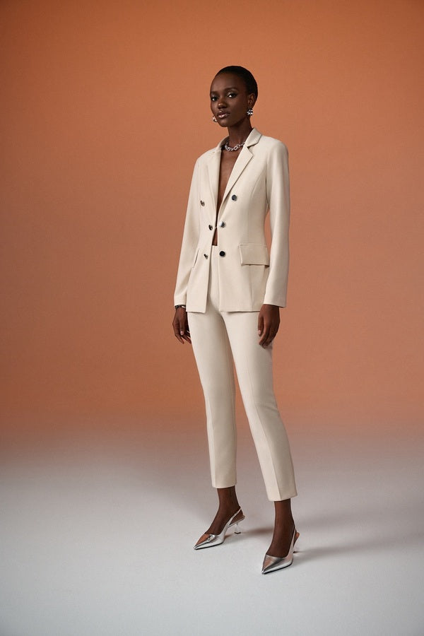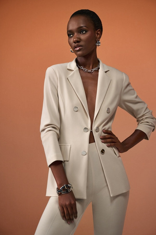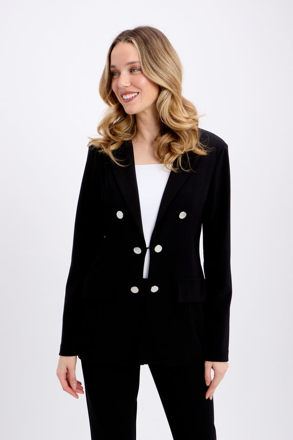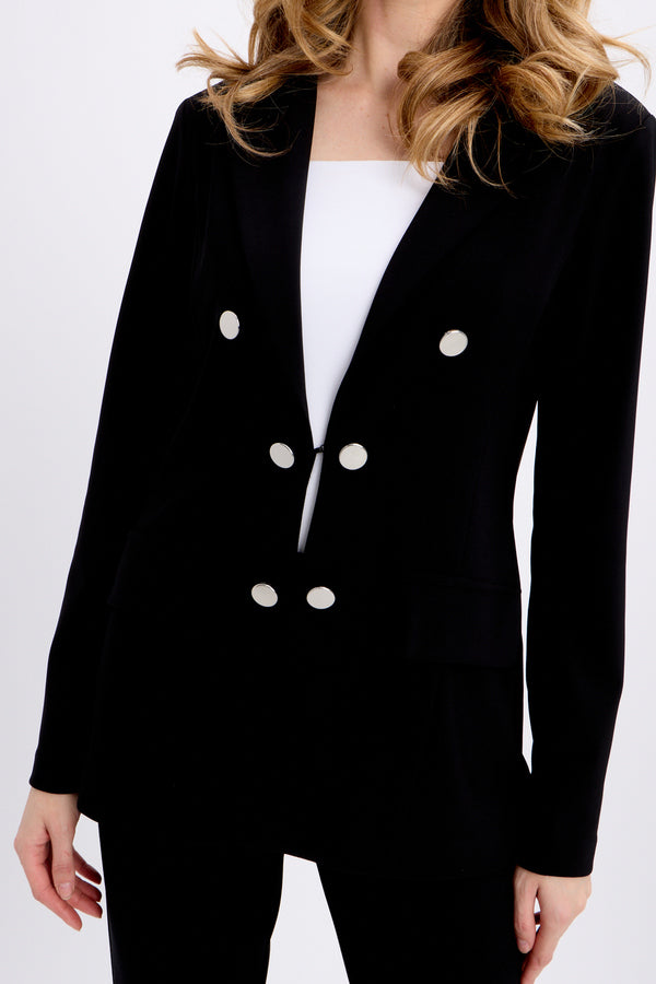 With its mock double button placket fitted with flat metallic buttons, this Joseph Ribkoff blazer offers a modern, elegant look inspired by the military aesthetic. These decorative details are complemented by a discreet clip that fastens up the jacket. To complete the look, the designer incorporated flap pockets and a narrow folded point collar, giving you a style that feels both practical and chic.