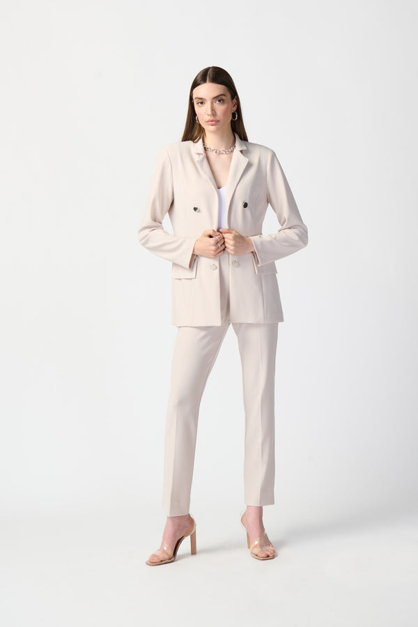 Discover these high-waisted pants with a chic and dressy appeal, thoughtfully designed by Joseph Ribkoff. These pants are adorned with decorative flat buttons at the hips, providing an elegant metallic touch that adds a touch of shine to the smooth fabric. These are also split at the back of the ankles, and boast pronounced pleats that not only refine but also elongate the legs, ensuring a stylish and sophisticated look.