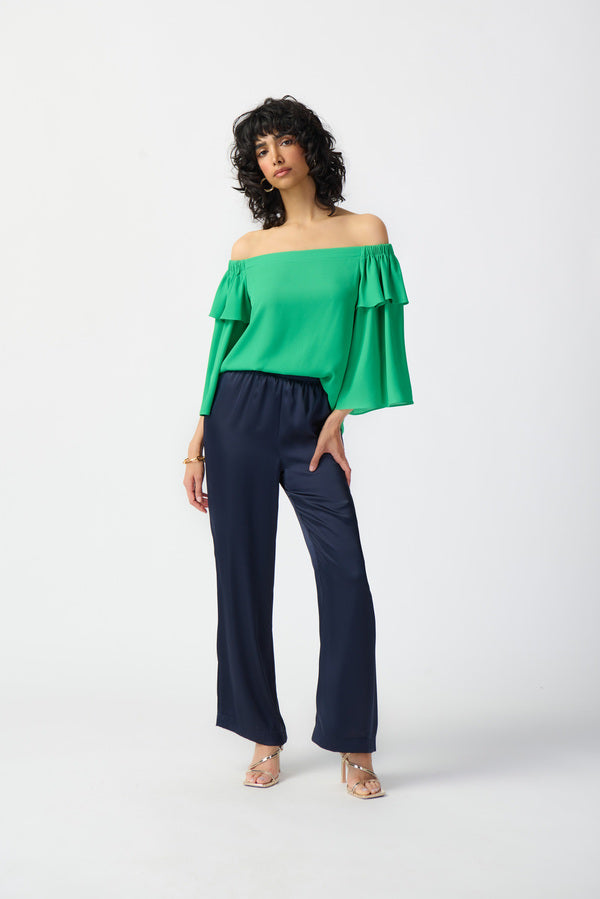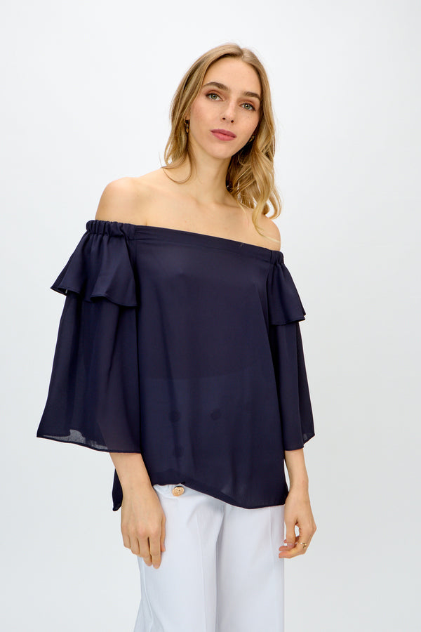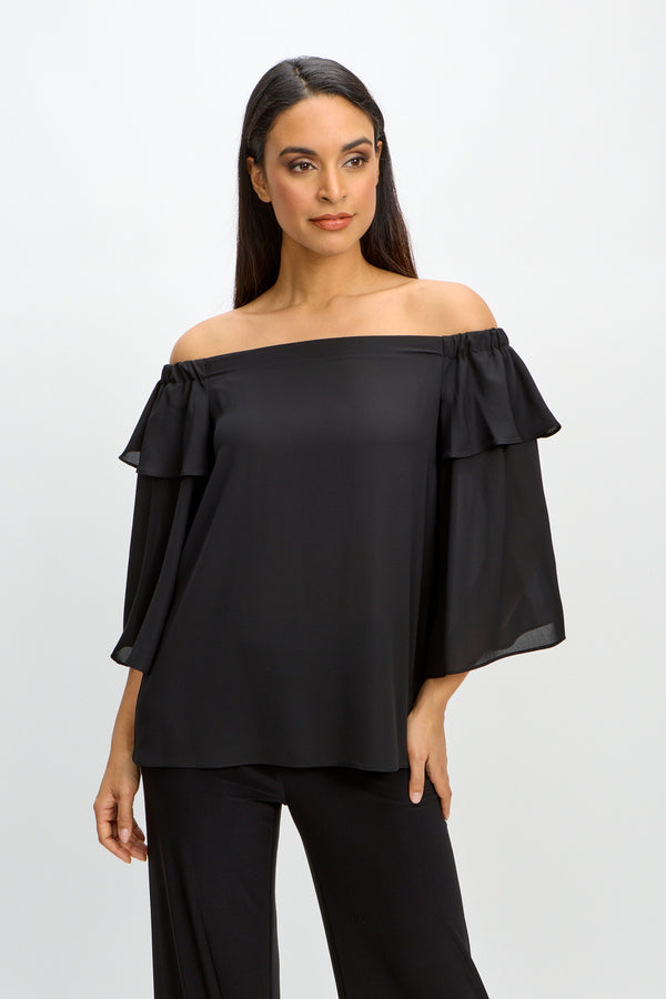 This Joseph Ribkoff top works some sunshine into your wardrobe. Whether you pair it with pants or a skirt, its voluminous ruffled sleeves will enhance your outfit while its alluring off-shoulder silhouette beautifully exposes your décolletage, framing it with a pleated design. Easy-to-wear, this beautiful style brightens up days or nights out.