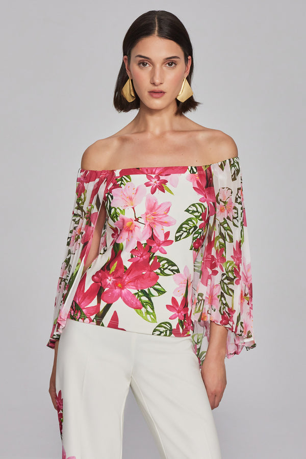Whether you wear it with a skirt or pants, this Joseph Ribkoff top will add a touch of freshness to your look. It features beautiful colourful flowers in an exotic style. Its open neckline is yet another sterling feature, bordered by long, draped, pleated and slit sleeves. The style also features cape sleeves that drape elegantly in the back.