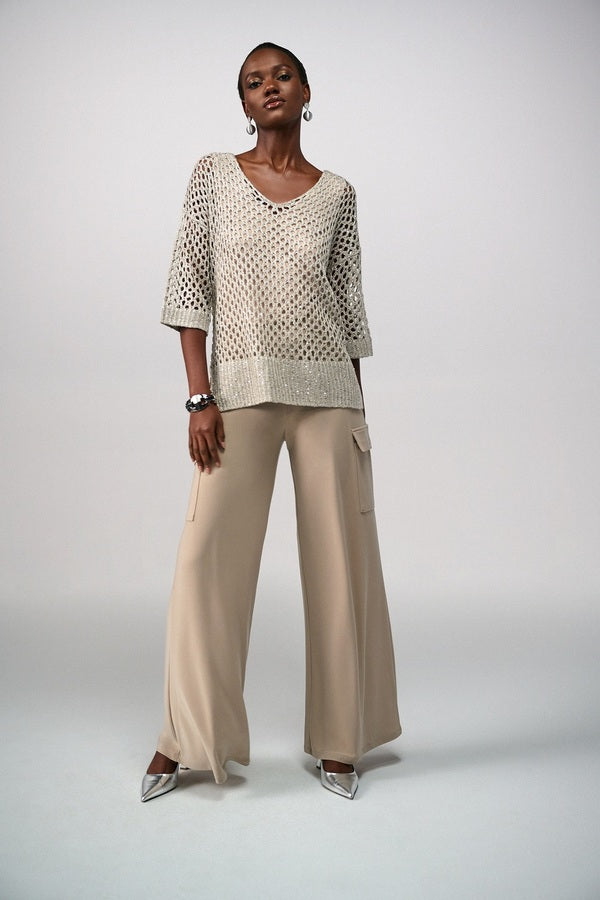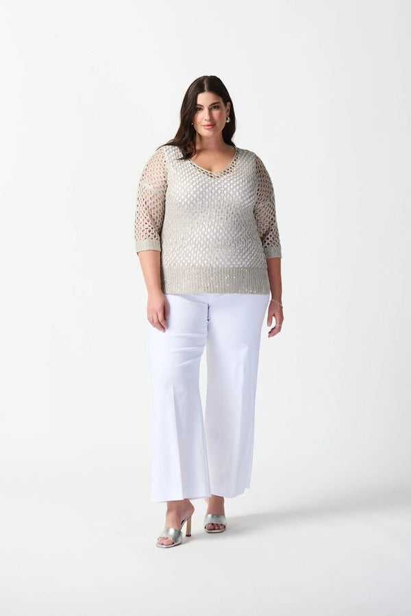 Made entirely of lace-inspired textured fabric, this V-neck top is a lightweight look designed by Joseph Ribkoff. Best paired with a matching undershirt, it also features small sparkling sequins made to brighten up its dense mesh. Finally, a wide band of opaque ribbing covers the hips.