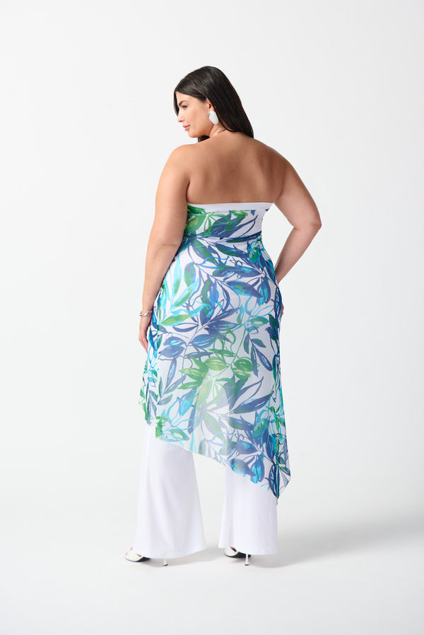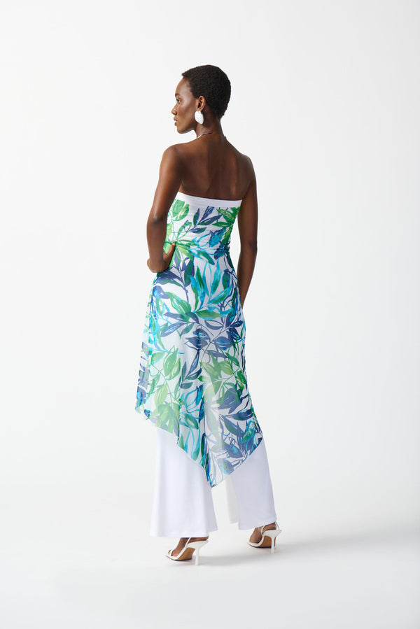 Exude grace with every step while wearing this silky knit strapless jumpsuit. The essence of feminine chic, this piece is beautifully tailored with a flared leg and a lovely sheer high-low overlay for added flair. The vibrant tropical print accentuates the look’s irresistible appeal.