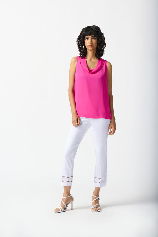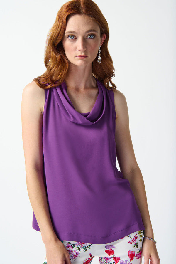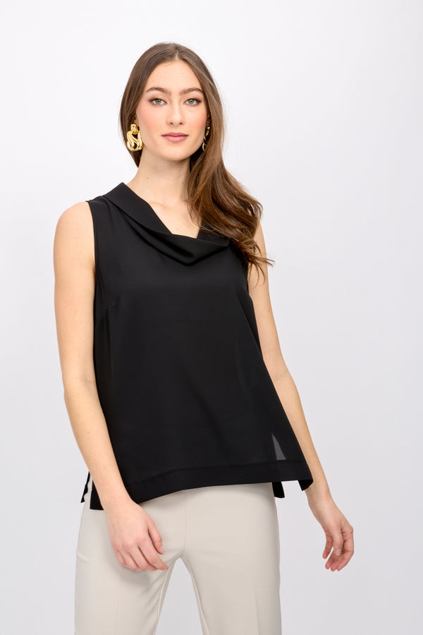 It's true summer elegance wearing this draped cowl neck top from Joseph Ribkoff. Crafted for both style and comfort, it features a flattering cowl neck design that adds volume and grace to any outfit. The sleeveless design makes it perfect for layering or wearing solo, while the draped fabric enhances its sophistication. Embrace chic versatility with this wardrobe essential.