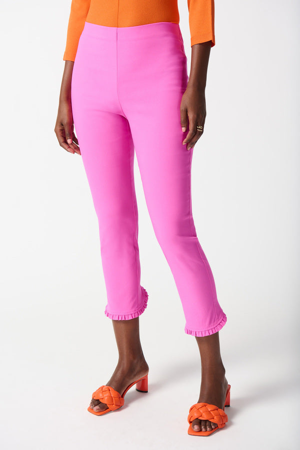 These Joseph Ribkoff capris will fit right in with the summer sun. Featuring a charming ruffle detailing along the cuffs of each leg, these are ultra-versatile bottoms that are both comfortable and stylish, offering a trendy twist to a classic design. Perfect for any occasion, they effortlessly add a touch of elegance to your outfit thanks to their frilly and feminine vibes.