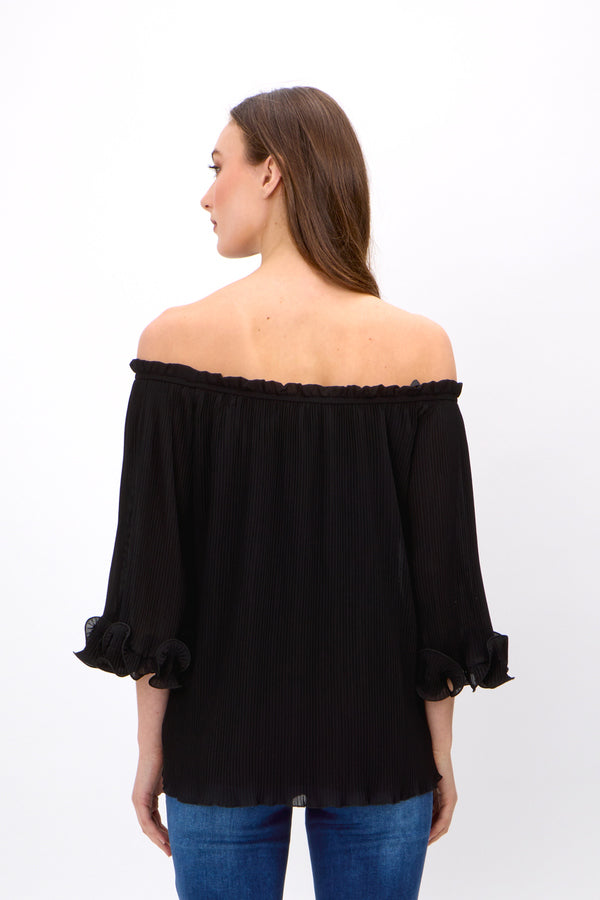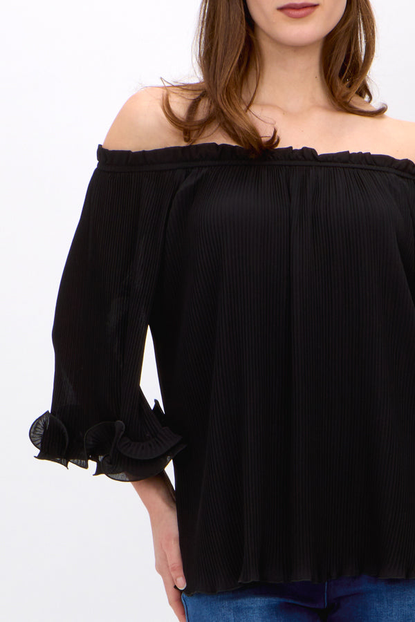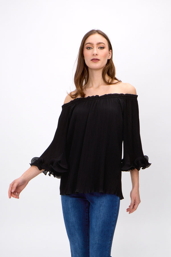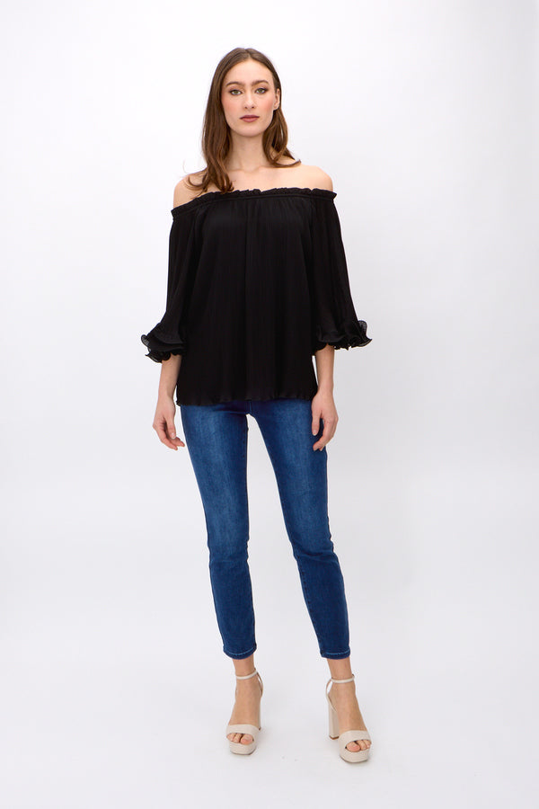 Fall for this romantic top from Joseph Ribkoff, an off-shoulder style that features a pleated textured and billowy fit. Ruffle sleeves round out the look, transforming this ladylike style into your new summer favourite. Because the top is so voluminous, we suggest styling it with tighter bottoms to create a sense of balance.
