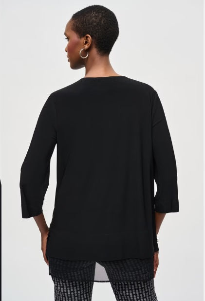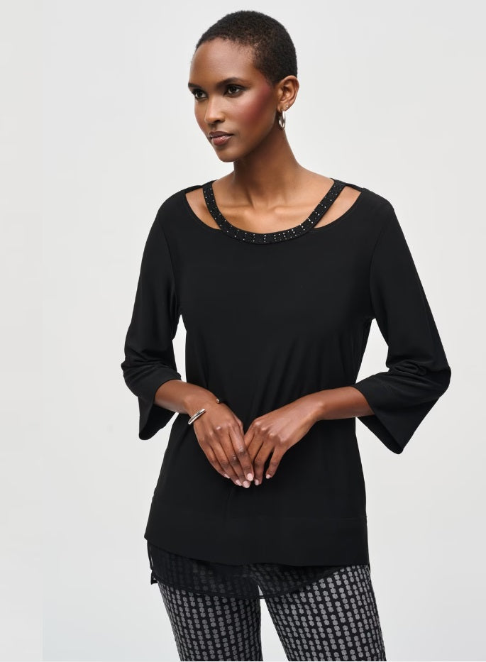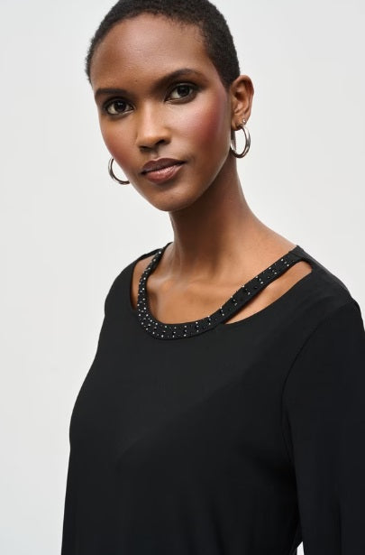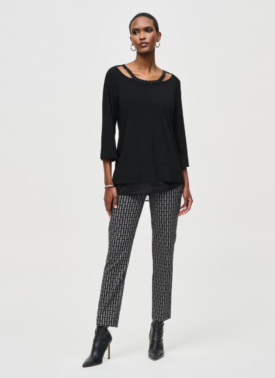 Crafted with an oversized fit and thigh-length design, this exceptional crew neck top from Joseph Ribkoff is a testament to minimalism. The 3/4 flare sleeves add a touch of elegance while the plain pattern subtly highlights the keyhole feature. Adorned with jewels, it encapsulates semi-formal style perfectly without compromising on comfort.