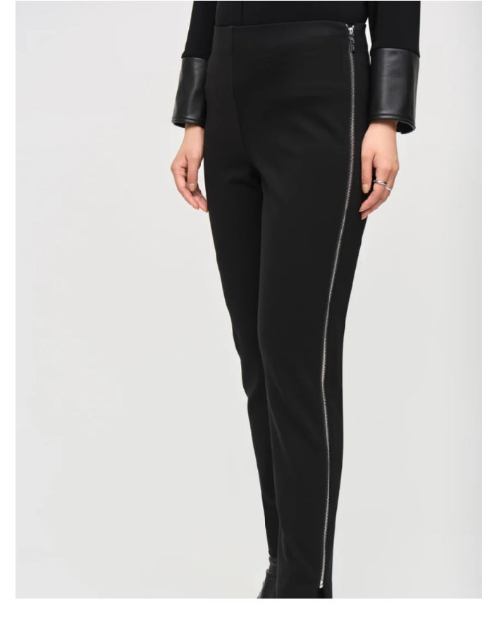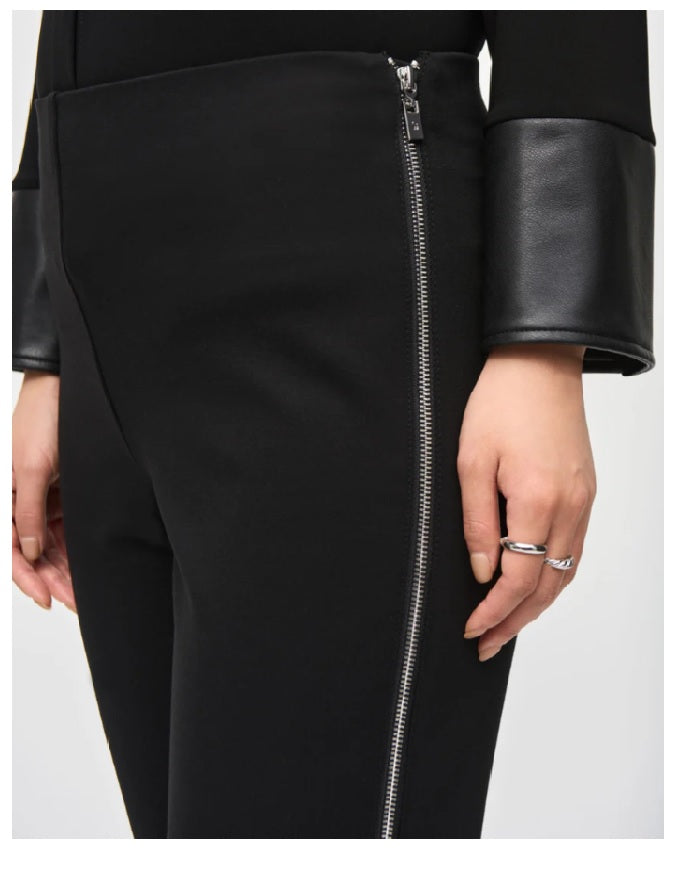 Exemplify casual elegance with these trousers, expertly crafted by Joseph Ribkoff. These slim-fit bottoms offer a high-rise waist and full-length cut for an unbroken silhouette. Featuring a plain pattern, they come adorned with a chic zipper detail and intentional slits. An ultimate addition to your wardrobe due to their stylish versatility.