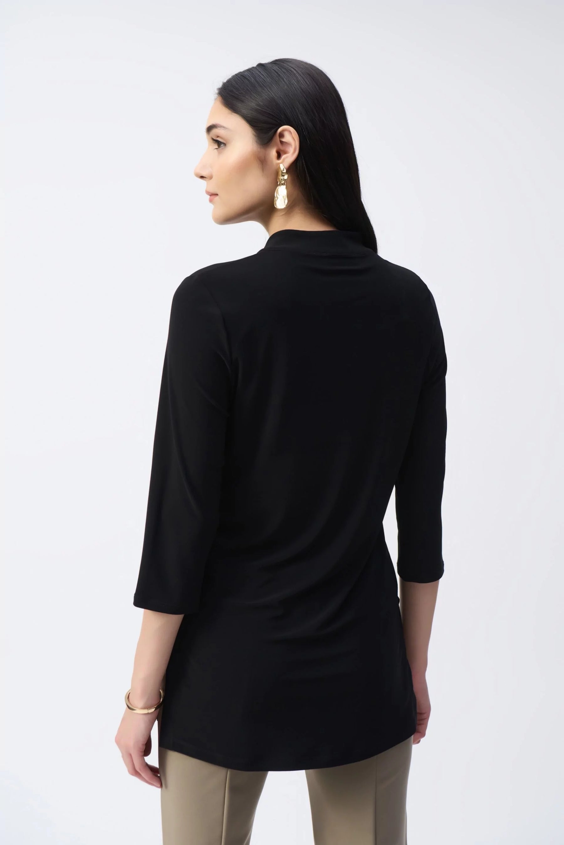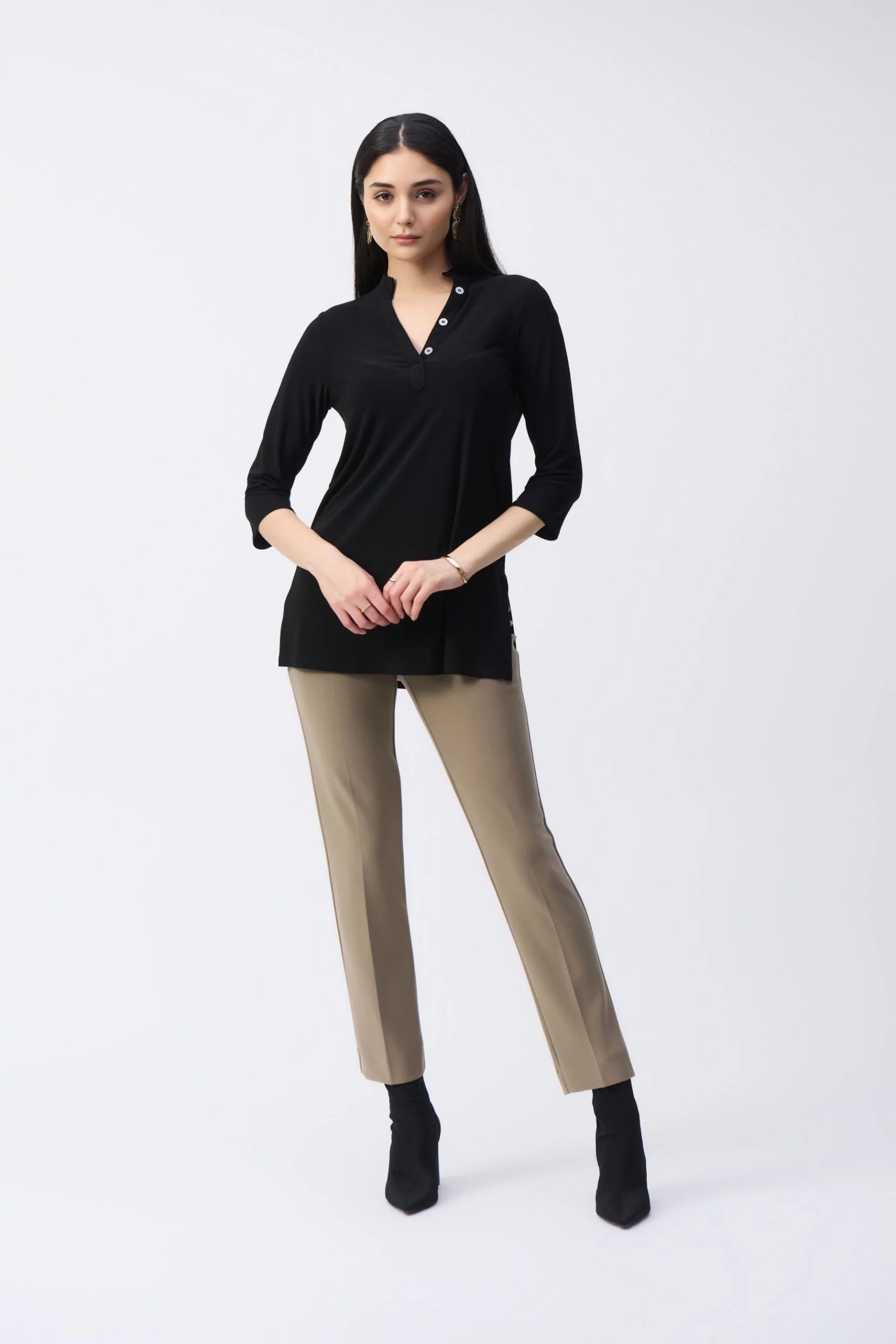 This tunic combines flexibility and refinement with a touch of whimsy. The three-quarter sleeves are trimmed with playful cuffs, while the tasteful mandarin collar is modernized with a front placket and buttons.