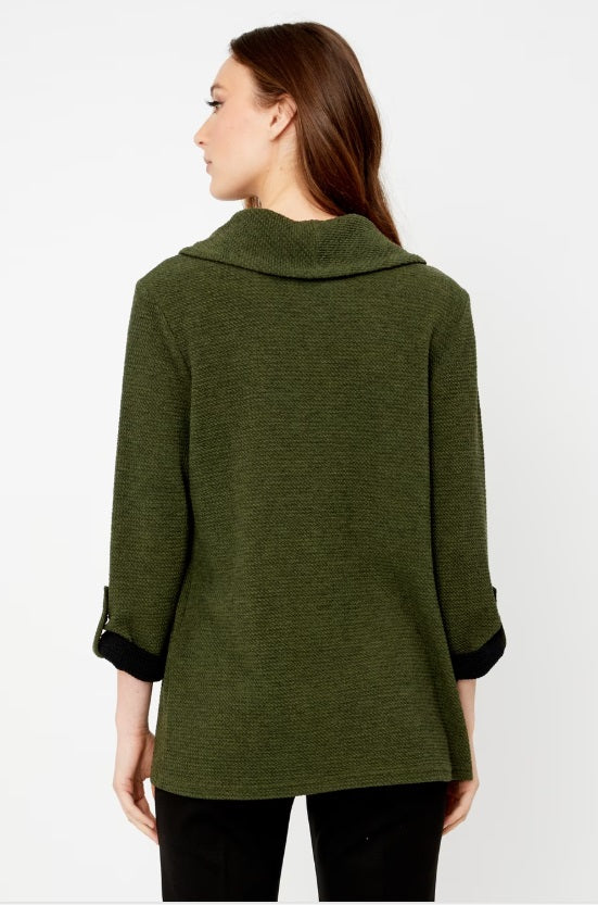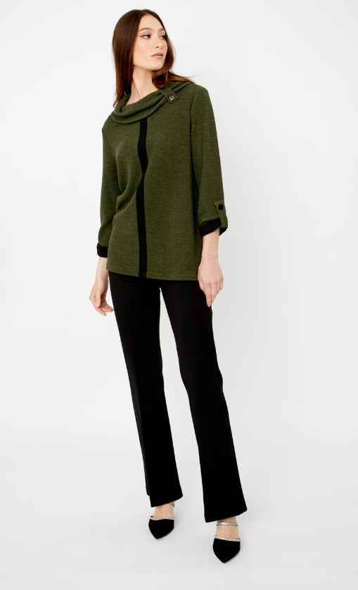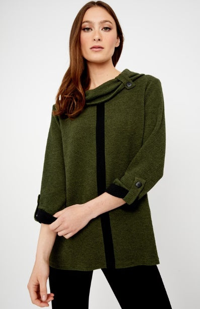 Experience luxurious comfort with this sophisticated sweater by Joseph Ribkoff. Boasting a cowl neck and thigh-length oversized fit, it presents laid-back charm in its marled pattern. The 3/4 straight sleeves bring a refined touch while the minimalist button details add subtle sophistication to your casual style repertoire.