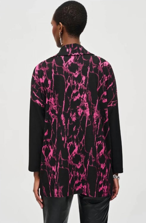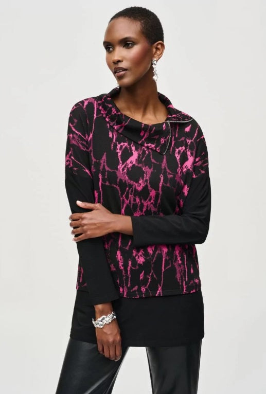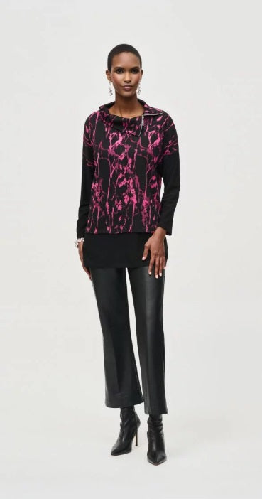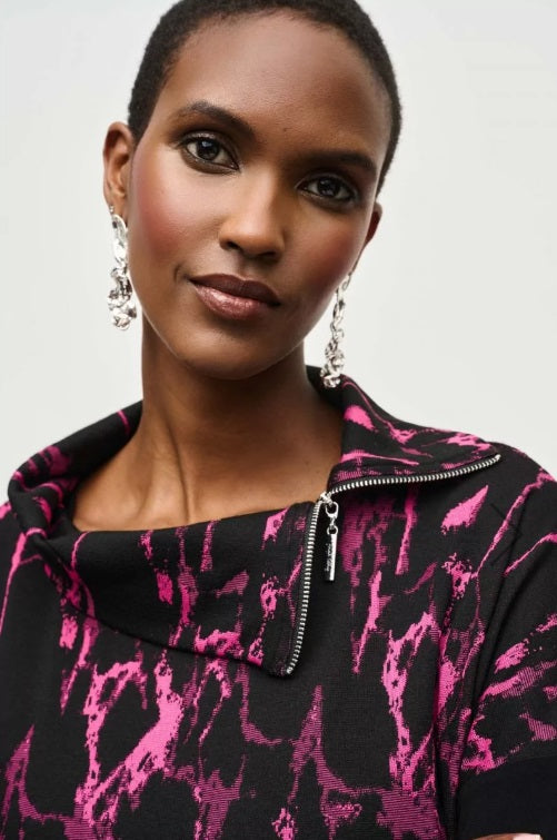 The jacquard sweater's distinctive pattern, combined with the solid silky knit and zipper detail, creates a statement Joseph Ribkoff top that merges style and comfort effortlessly.