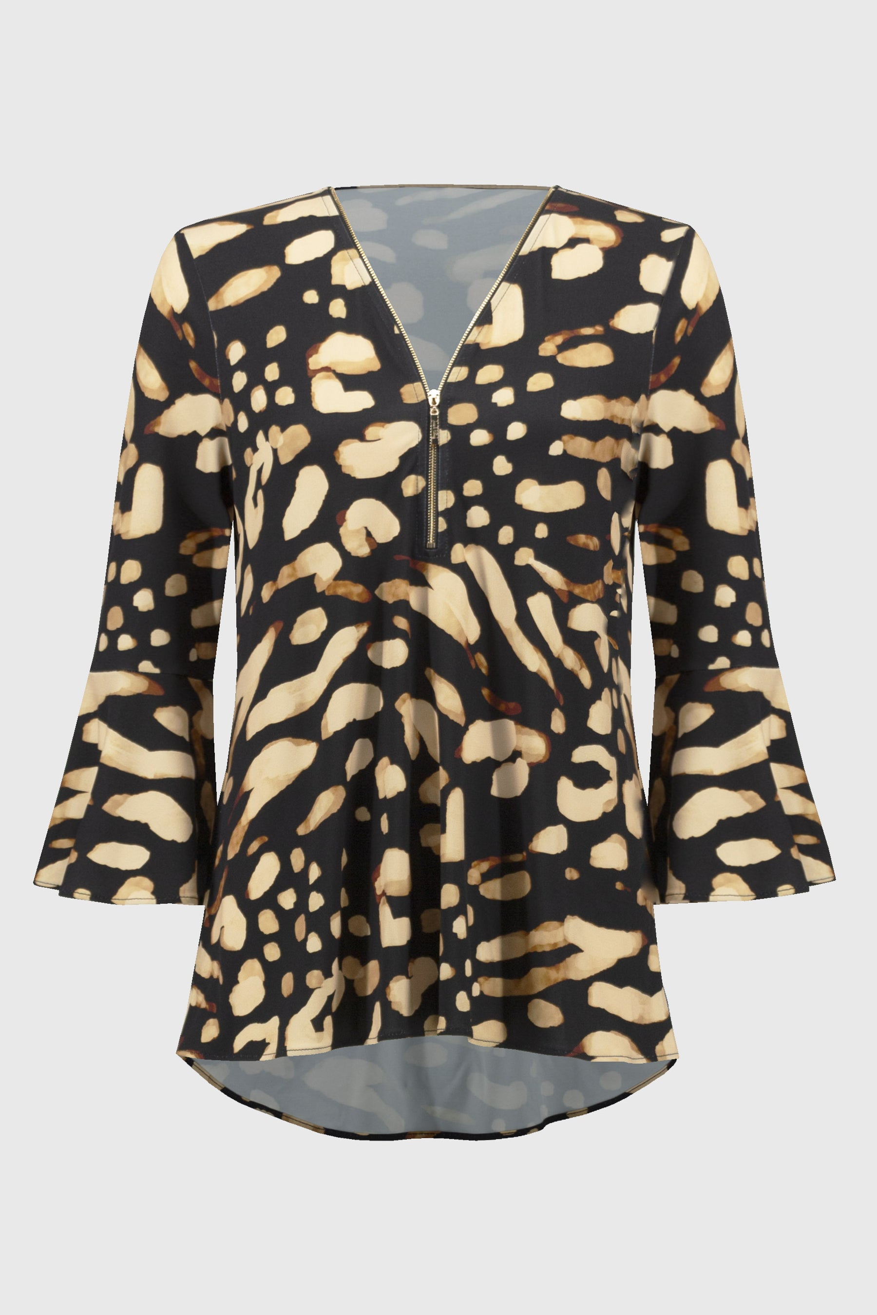 Elevate your style with the Joseph Ribkoff occasion top. This hip-length, v-neck top features a flattering regular fit and 3/4 flare sleeves, perfect for a casual yet chic look. The animal print adds a touch of sophistication, while the zipper adds a modern twist. Embrace your unique style with this versatile top.