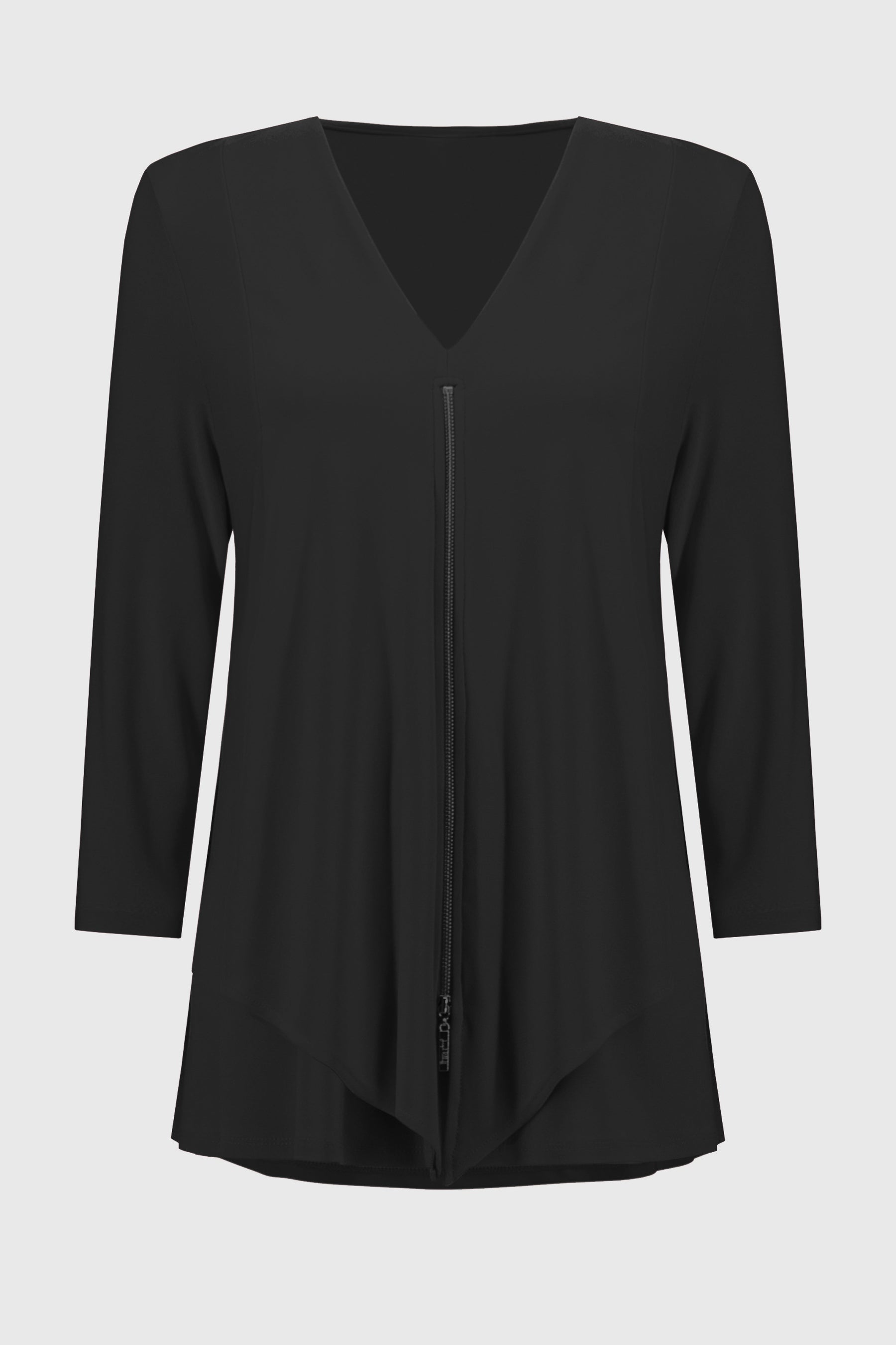 Discover the perfect blend of chic and casual with this Joseph Ribkoff piece. Designed with a fitted silhouette and hip-length cut, it features a stylish v-neck and 3/4 straight sleeves. The zipper closure adds a touch of modern flair, making it ideal for both casual outings and night events. This plain-patterned top effortlessly combines comfort and style, ensuring you look your best wherever you go.