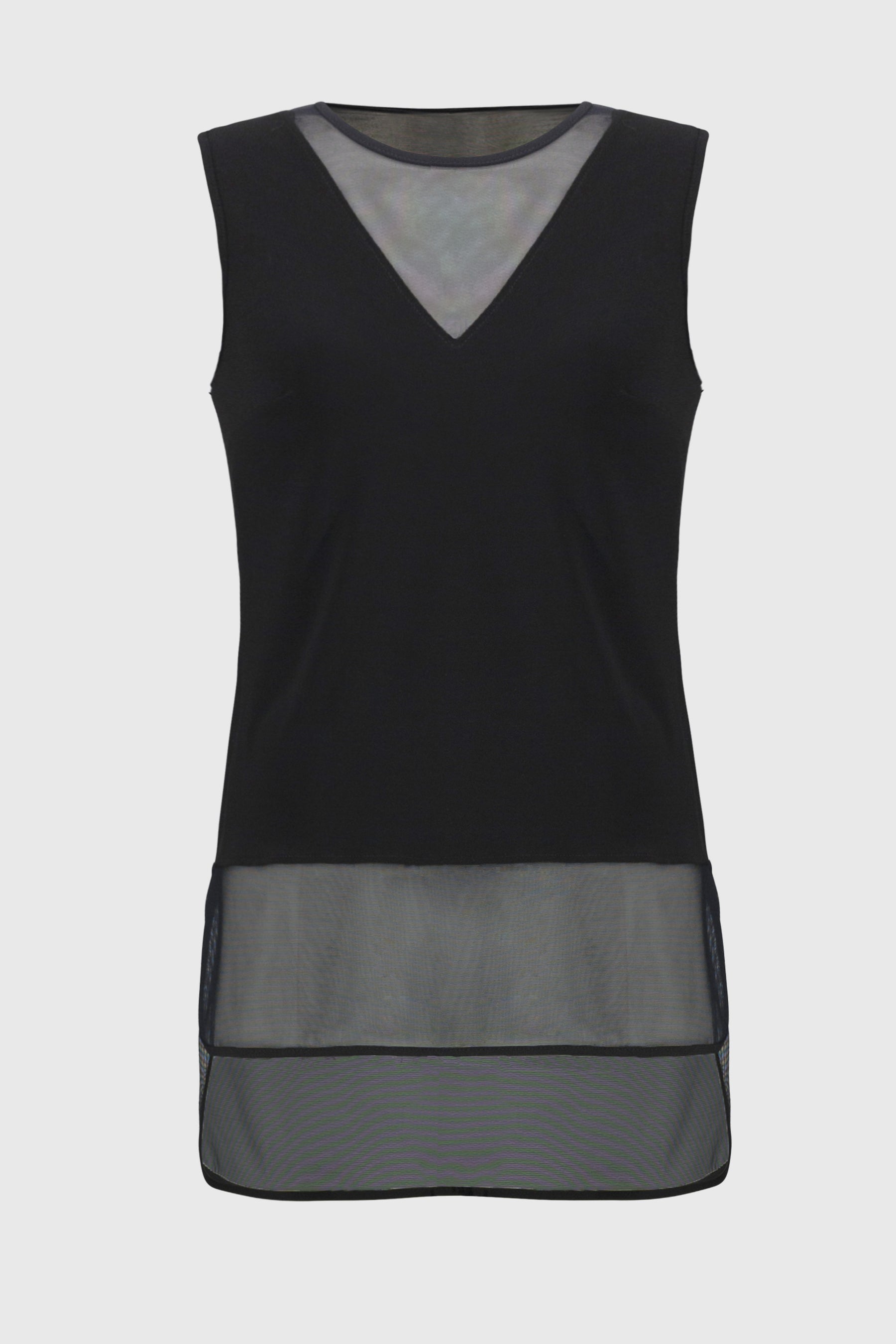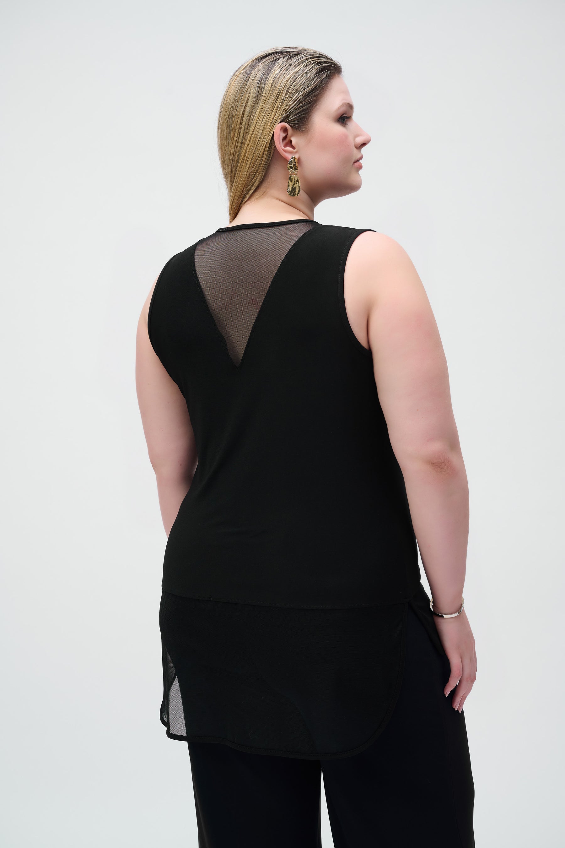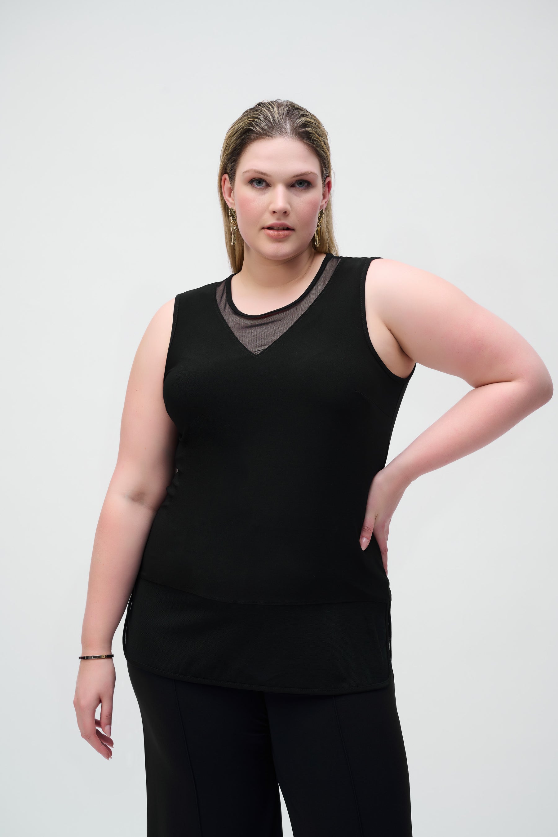Discover the perfect blend of chic and minimalistic style with this Joseph Ribkoff sleeveless top. Designed with a flattering v-neck and regular hip-length fit, it features a pullover style for easy wear. Ideal for casual outings, night events, or semi-formal occasions, its sheer, layered mesh fabric adds a touch of sophistication to your wardrobe.