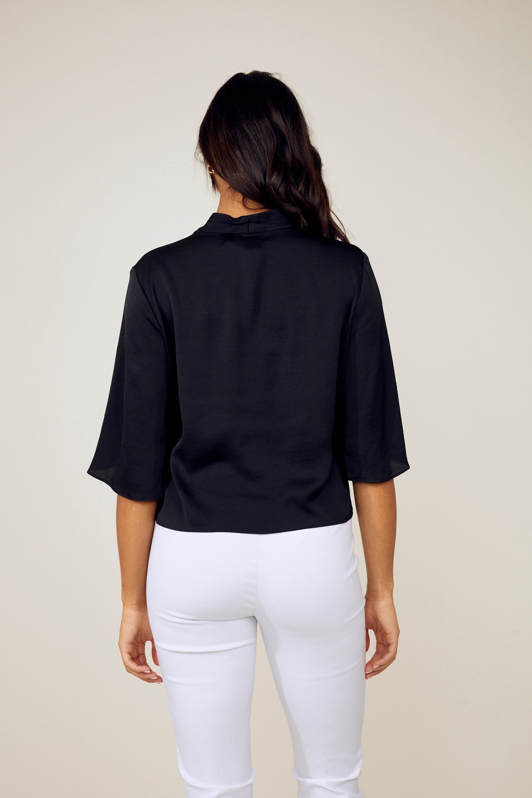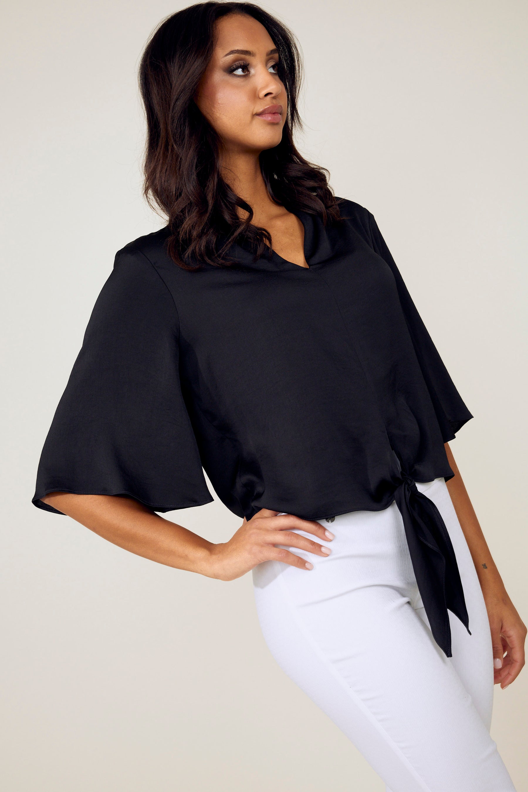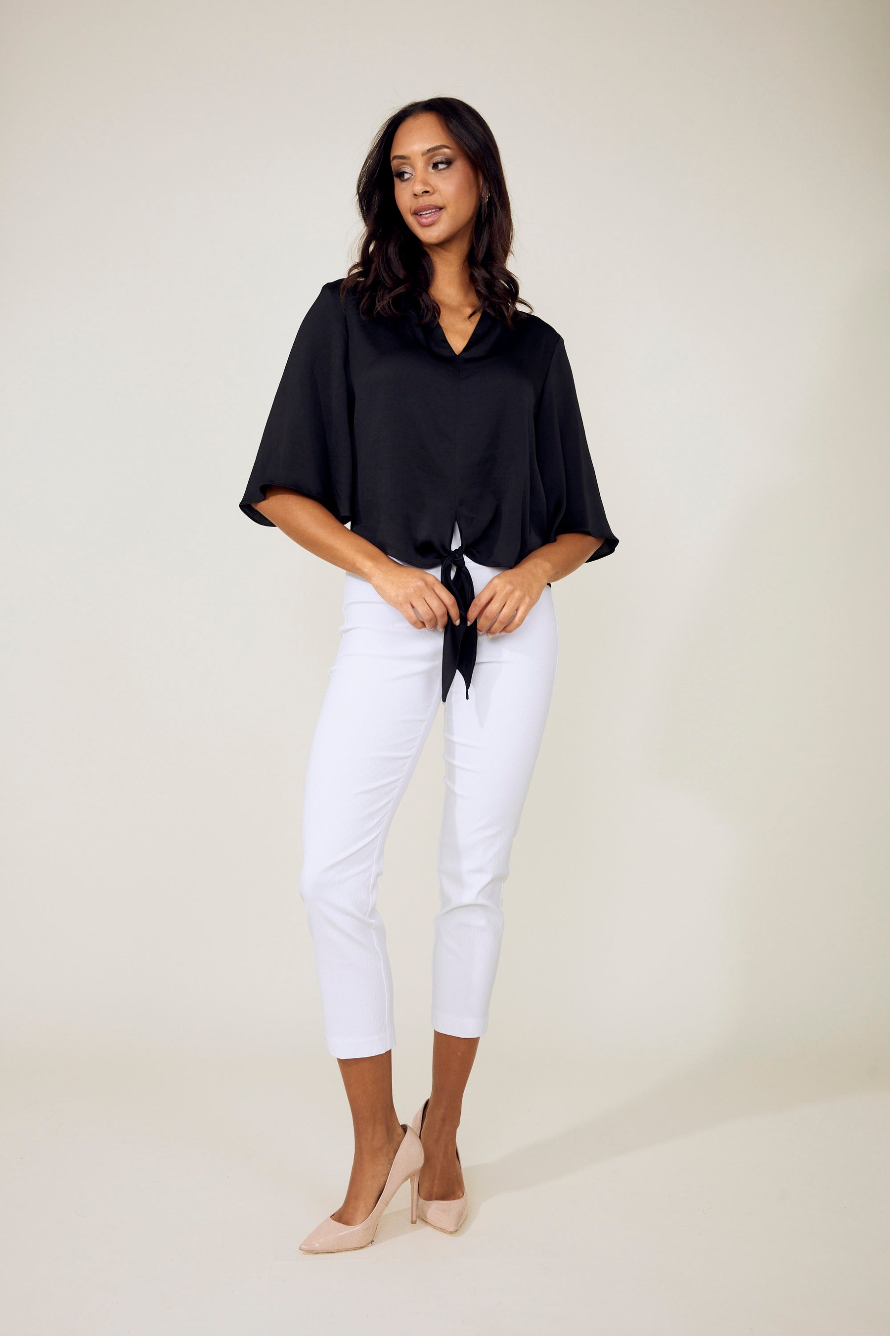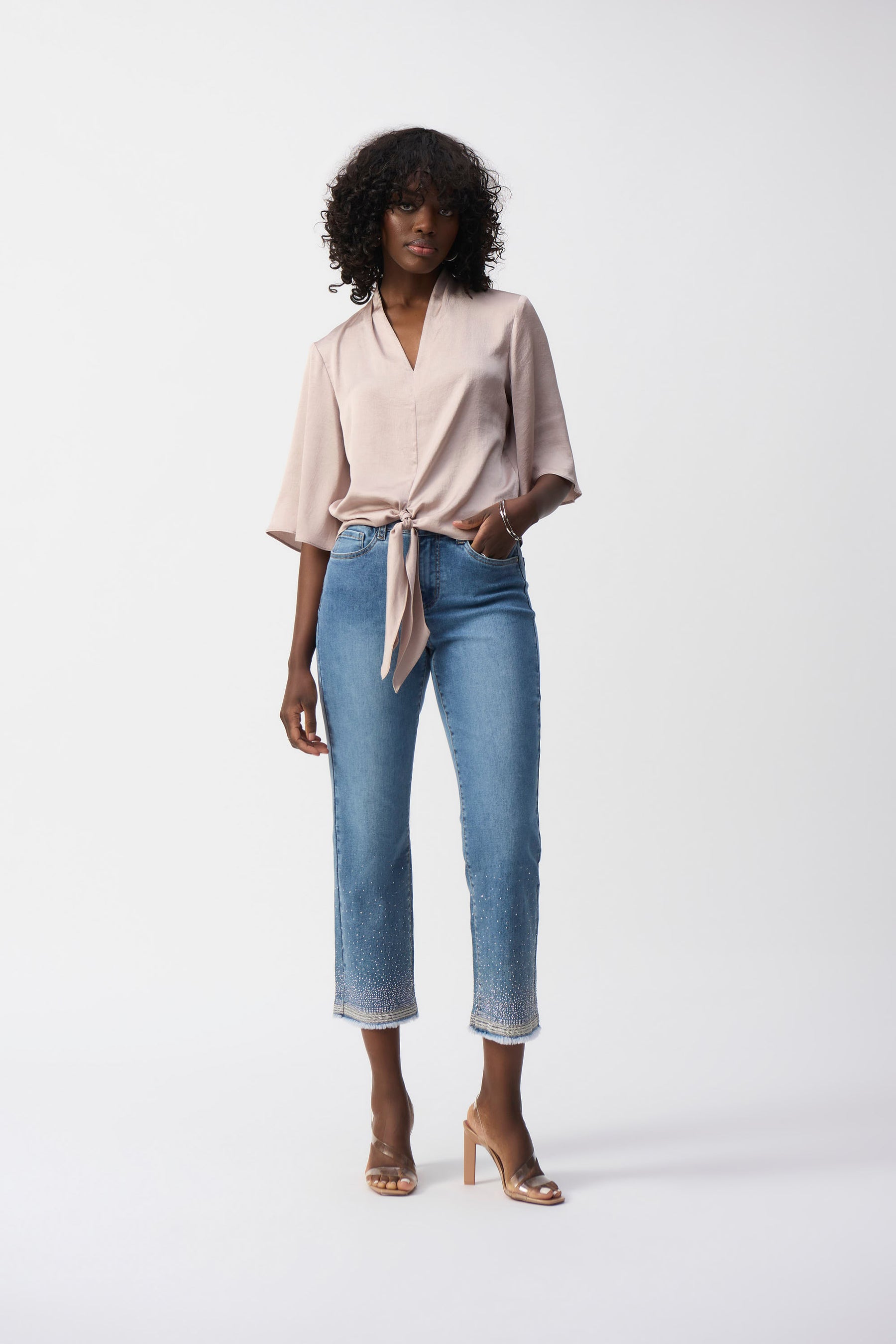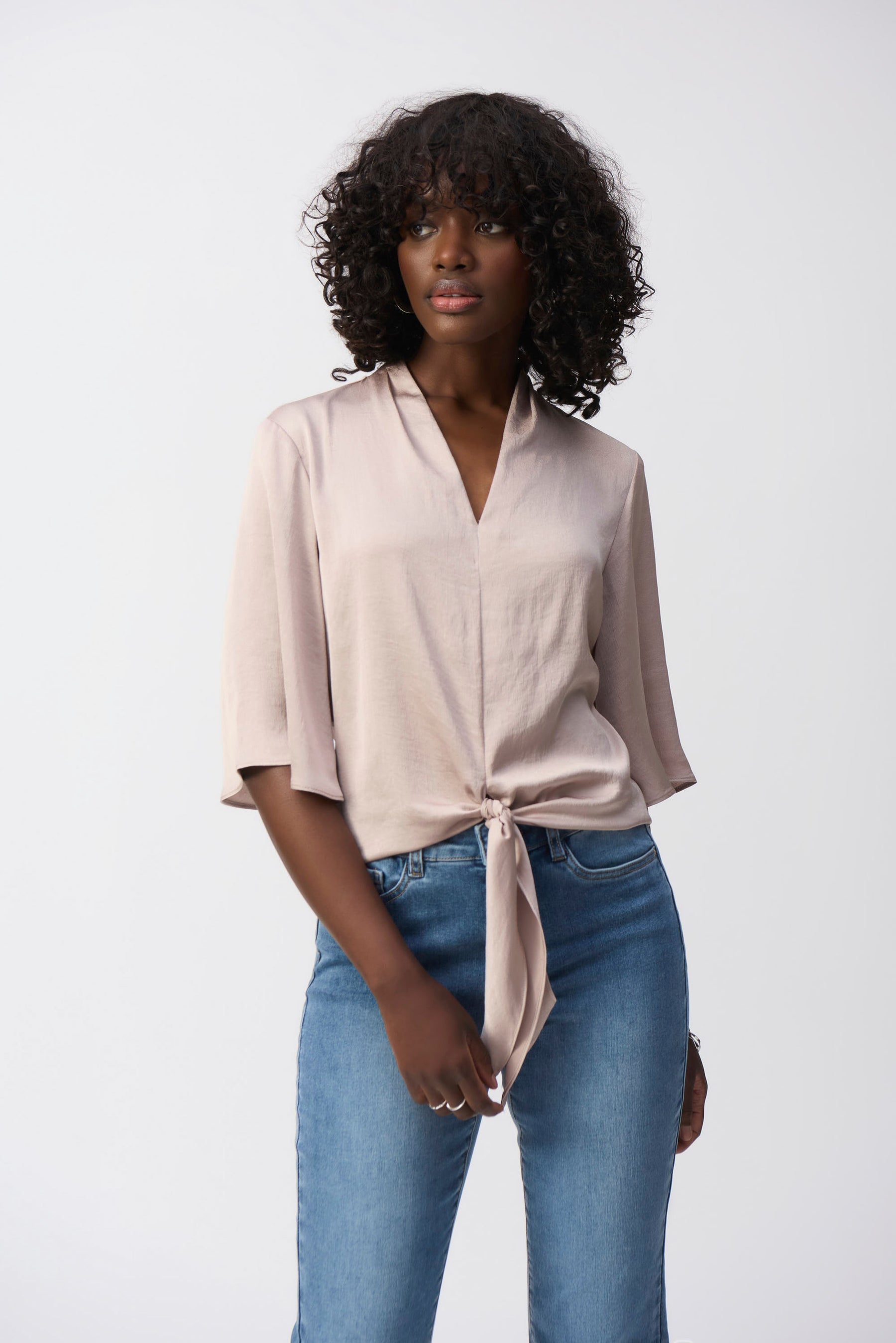 Discover effortless elegance with the Joseph Ribkoff waist-length top, featuring a chic v-neck and relaxed fit. Designed for casual summer days, this plain, knotted masterpiece boasts 3/4 flare sleeves and a stylish tie closure. Perfectly blending casual and chic styles, it's an ideal addition to your wardrobe for a laid-back yet sophisticated look.