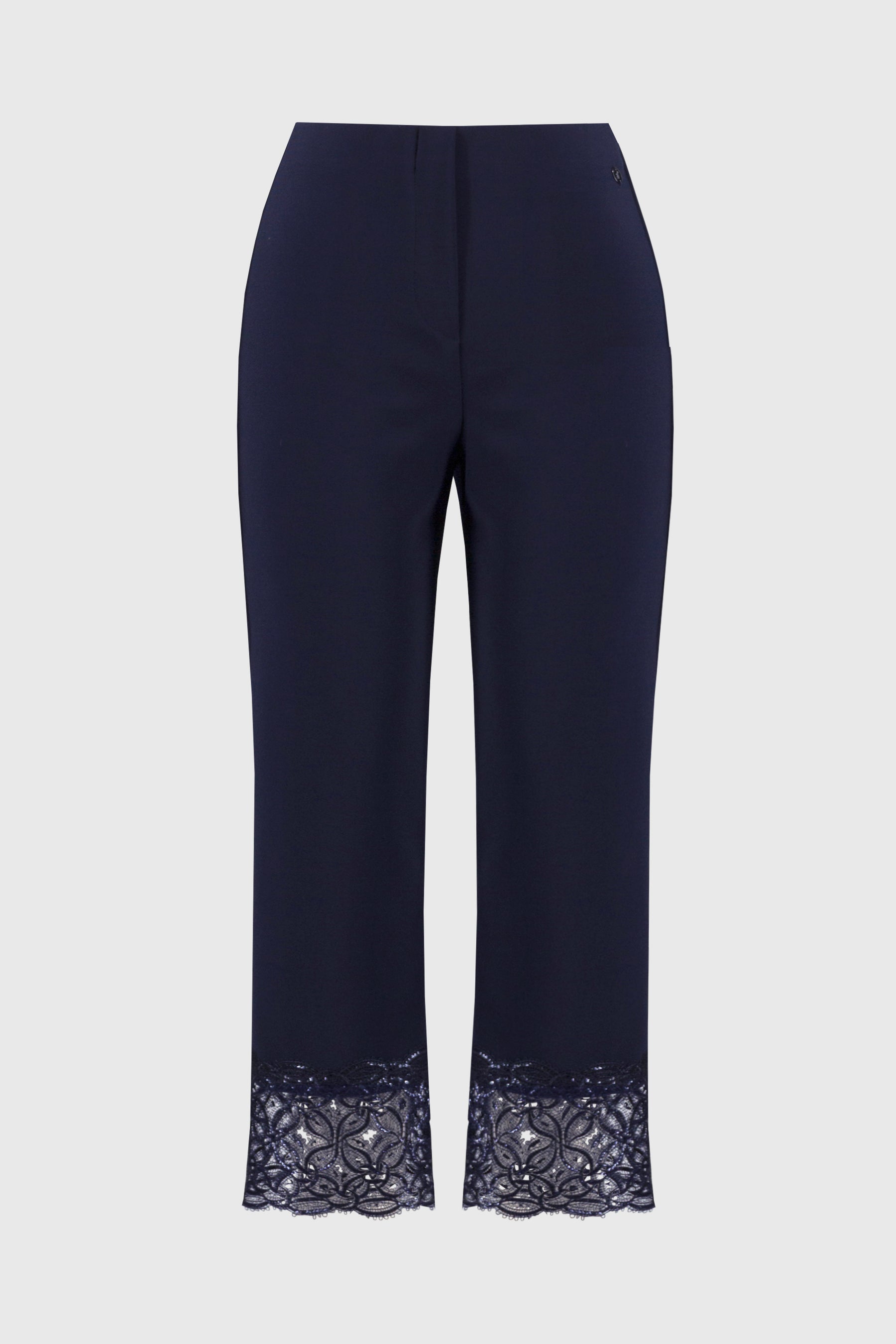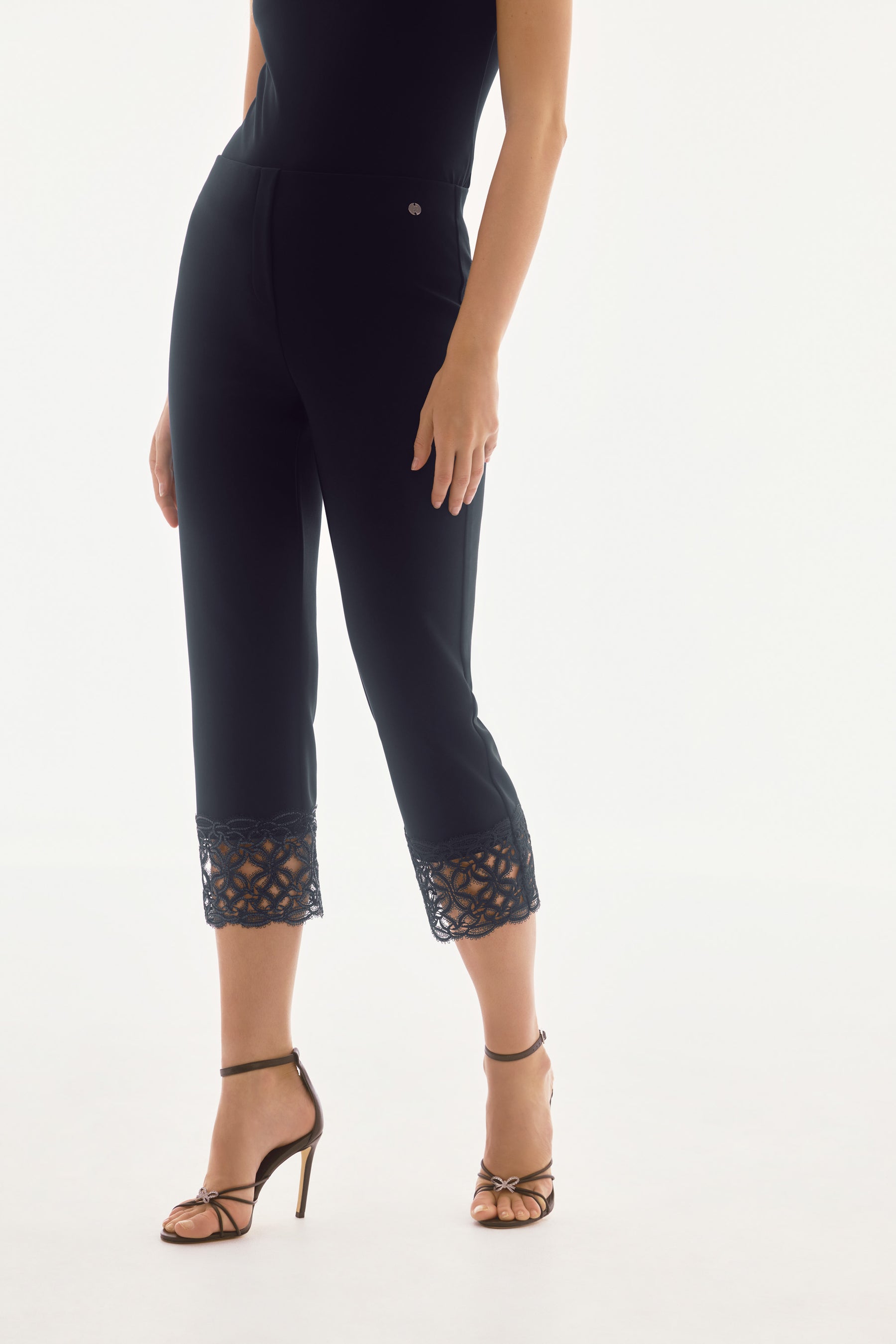 Step into sophistication with these Joseph Ribkoff trousers, designed for both formal and casual occasions. Featuring a mid-rise waist and a slim fit, these cropped bottoms offer a flattering silhouette. Adorned with a lace trim, belt, and buttons, they exude a feminine and business-savvy style. The plain pattern adds a touch of elegance, making them a versatile addition to any wardrobe.