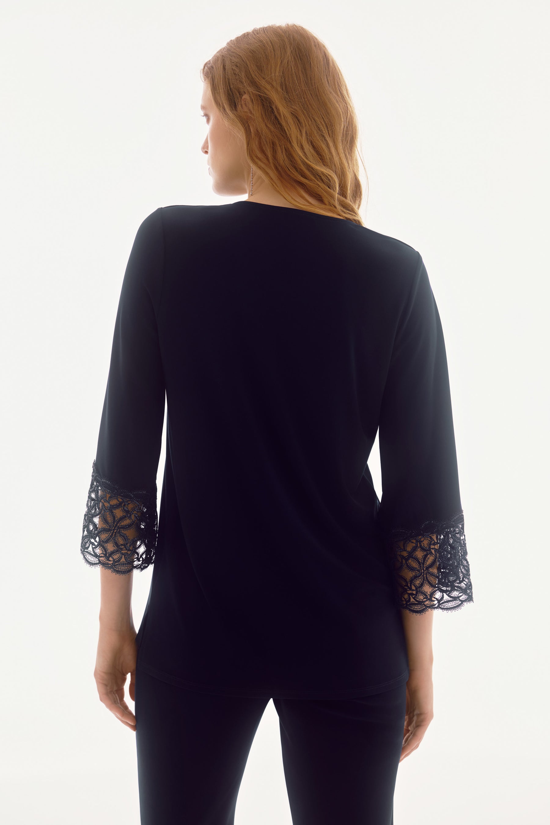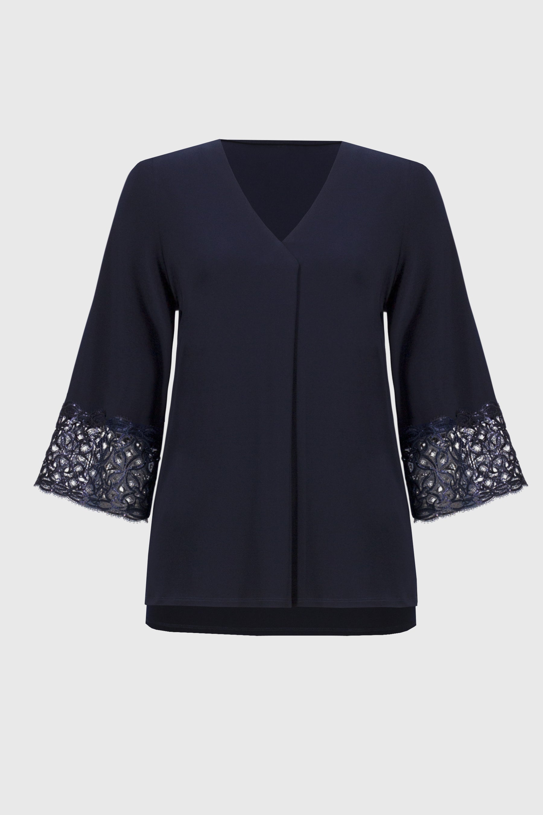 Discover the perfect blend of chic elegance with this Joseph Ribkoff top. Designed with a regular fit and hip-length cut, it features a sophisticated V-neckline and stylish 3/4 bell sleeves. The plain pattern is complemented by a delicate lace trim, making it a versatile piece for any occasion. Embrace timeless style and comfort with this must-have addition to your wardrobe.