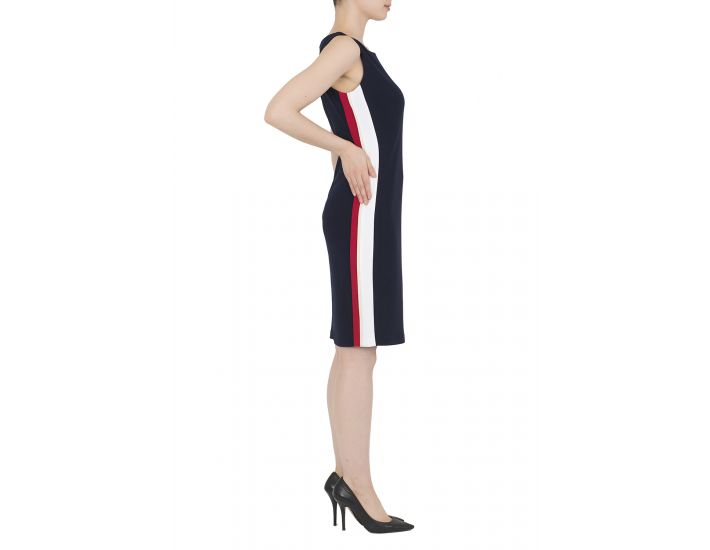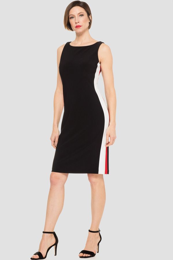 Fitted through the natural waist, this slip dress from Joseph Ribkoff includes sleeveless upper with bateau neckline, high-contrast color pattern through the sides and a slight flare from the hip