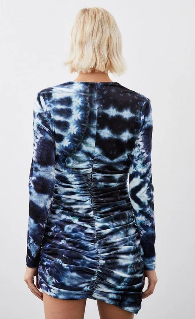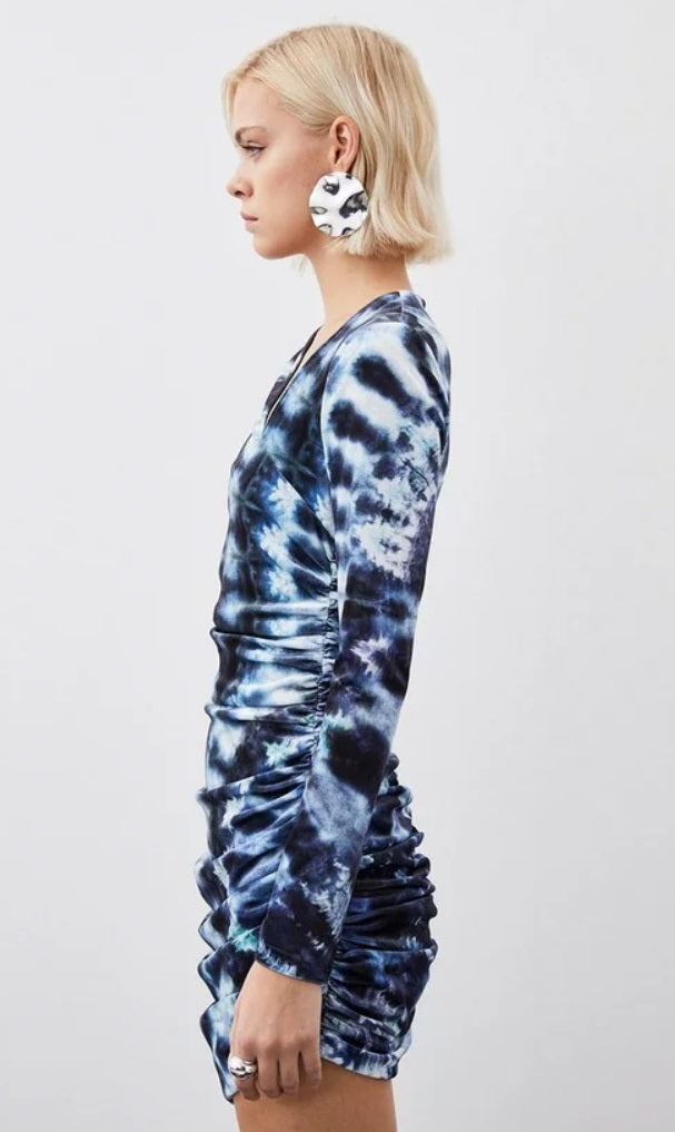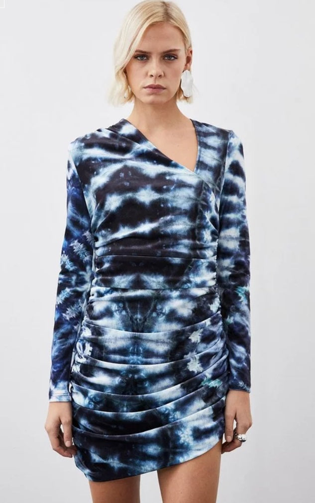 Vibrant with a tie-dye print all over, this velvet infused midi dress sculpts the silhouette in a pencil fit and rushed effect for a sultry touch. Presented with long sleeves and a contemporary asymmetric cut neckline, pair with barely-there heels for stand-out partywear.