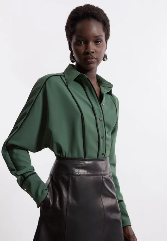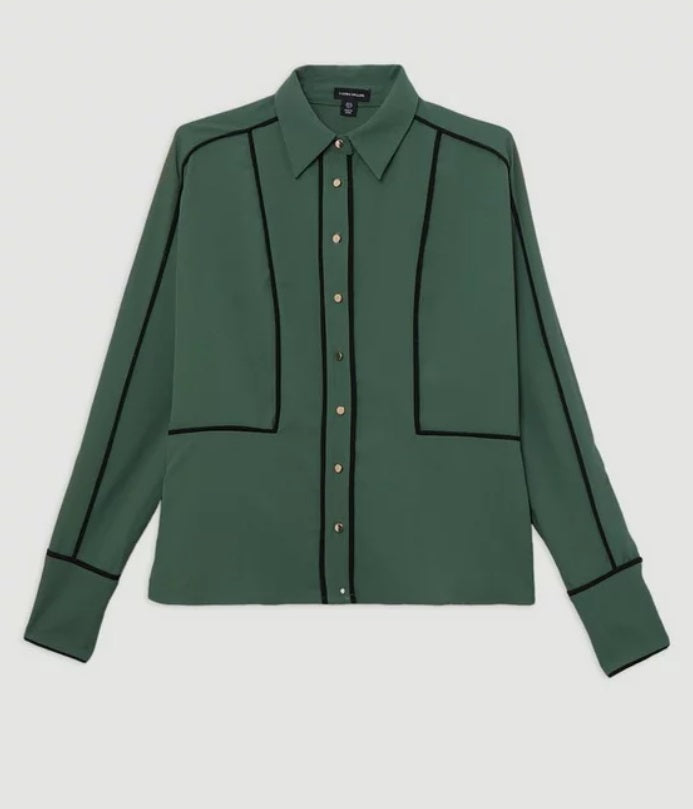 Embrace refined casual style with this twill woven shirt from Karen Millen. The contrast piping detail adds a modern twist to a classic silhouette, making it perfect for the fashion-forward woman who appreciates subtle sophistication. Its loose fit offers both comfort and versatility, allowing for easy layering or a relaxed standalone look. Style this shirt with tailored trousers and loafers for a smart daytime ensemble, or pair it with dark denim and ankle boots for a chic weekend outfit. The shirt's adaptable nature makes it ideal for various casual occasions, from family gatherings to lunch dates with friends. Its ability to transition seamlessly from day to night ensures you'll always look put-together, whether you're running errands or enjoying an impromptu dinner out.