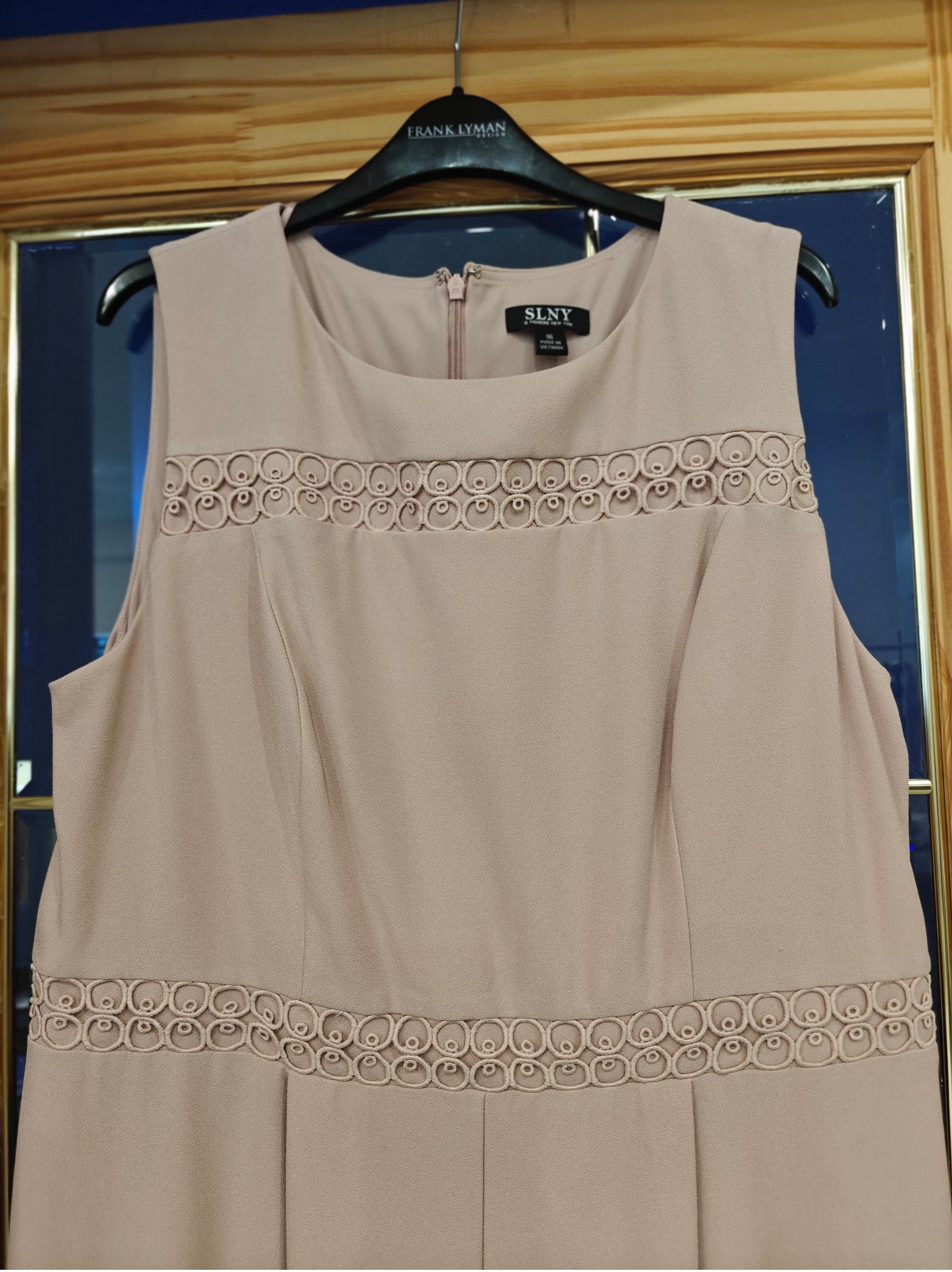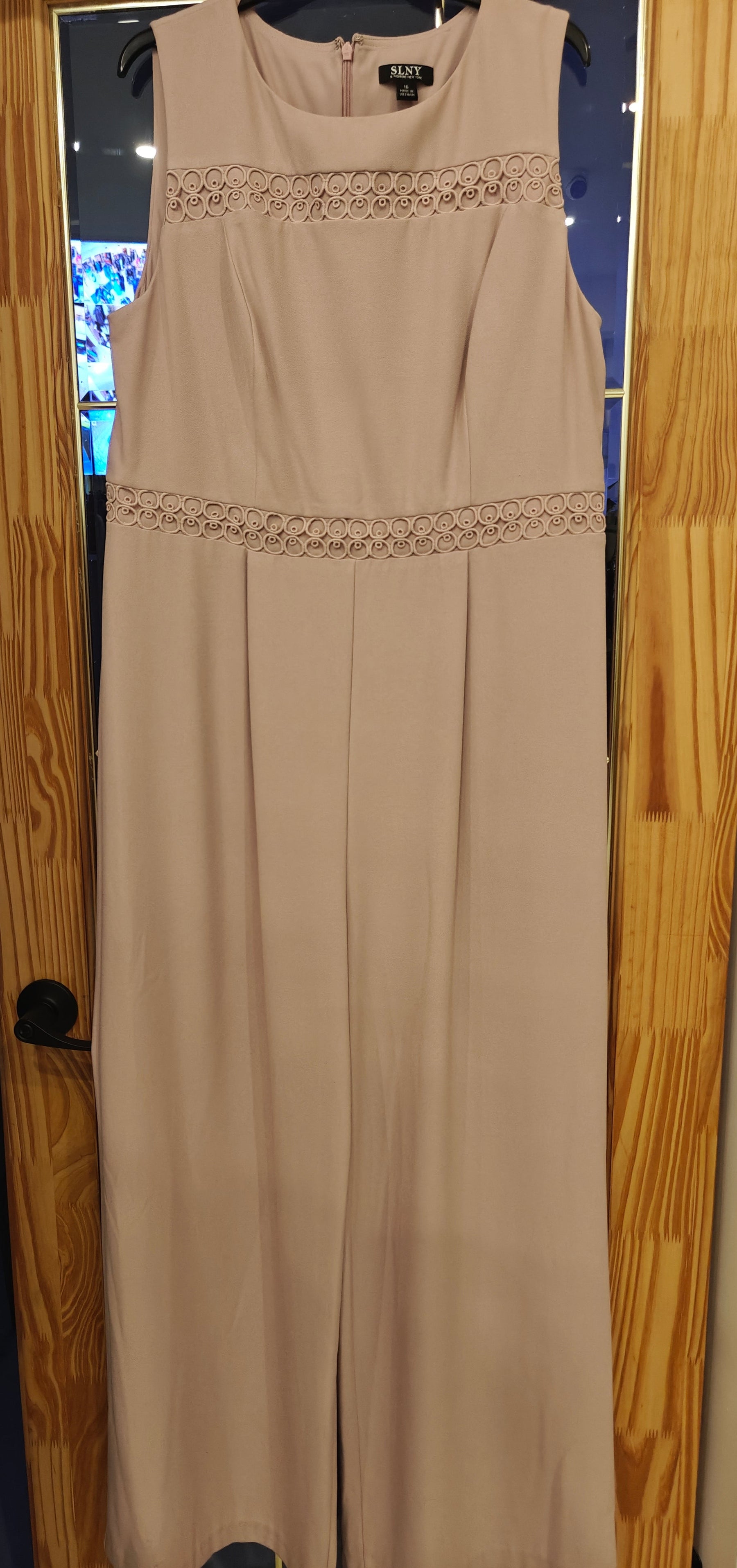 The jumpsuit is made in a plain color, the neckline is round, sleeveless, at the waist there is an hemstitch sewn over the main fabric. The legs are very wide, pinched at the waist.