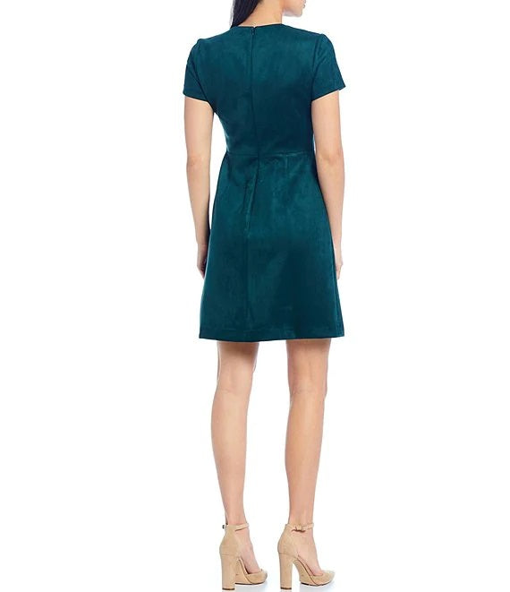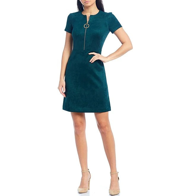 Calvin Klein Faux Suede Zip Crew Neck Short Sleeve A-Line Dress