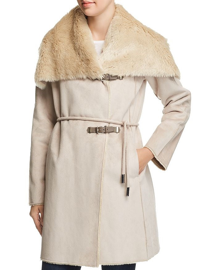 Calvin Klein Womens Faux Shearling Jacket with Faux Fur Collar and Buckle Closure – Latte