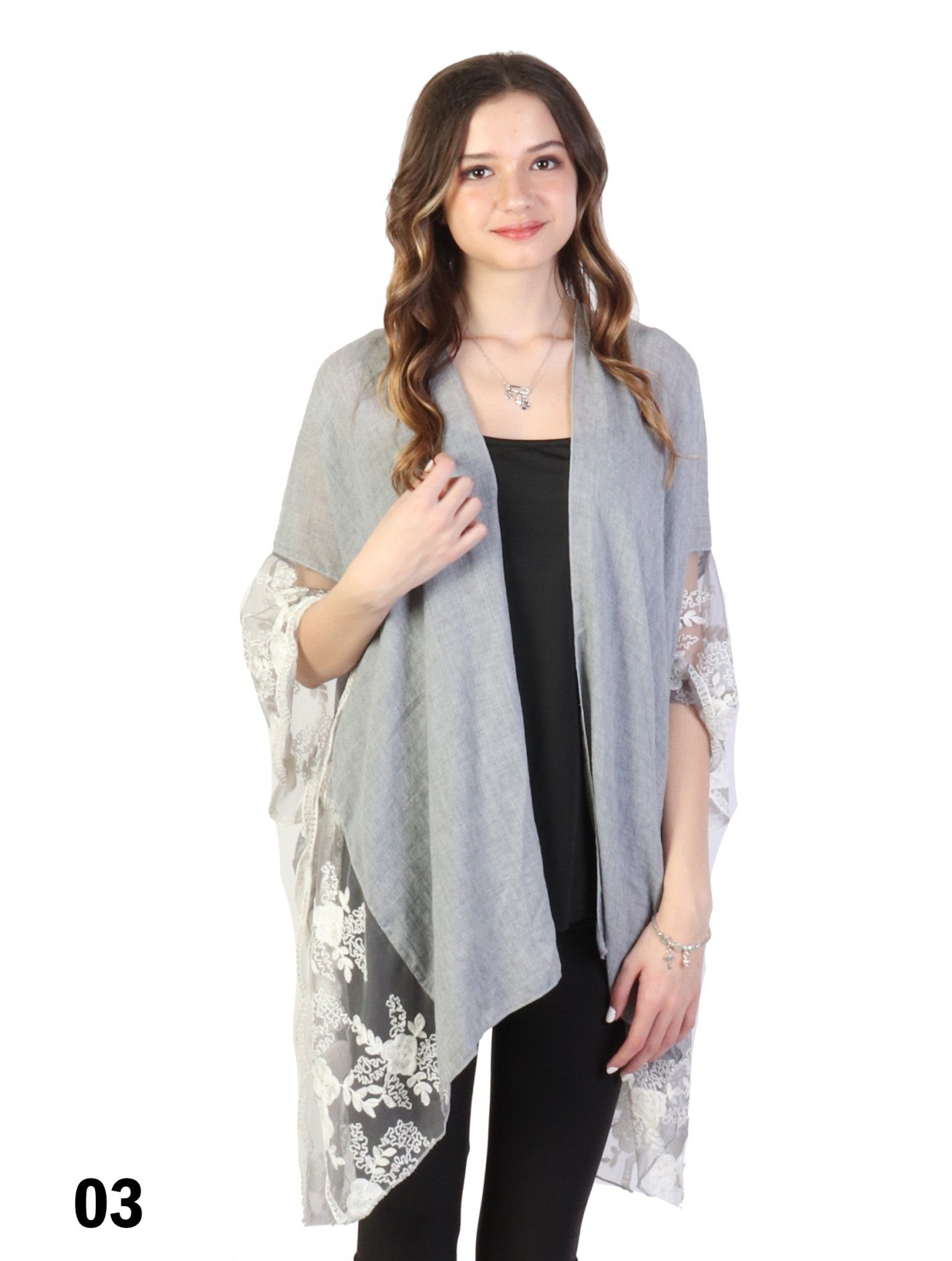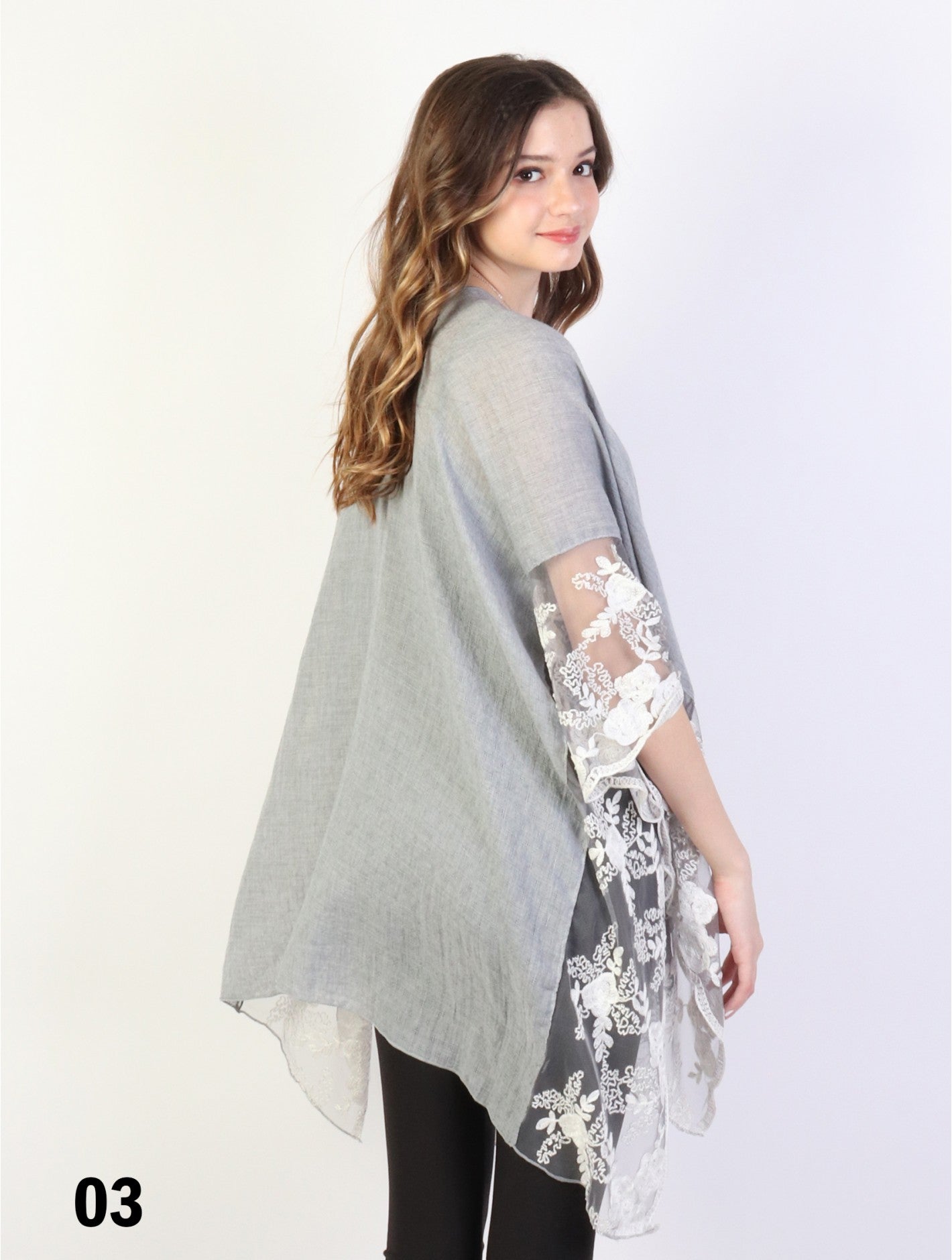 Open front kimono with some roses embroidered on some light mesh on the sides. Designed with lightweight and soft material to make it ideal for warm weather like spring and summer. The open front gives a loose, flowy feeling and makes it easy to throw it on quickly and effortlessly.