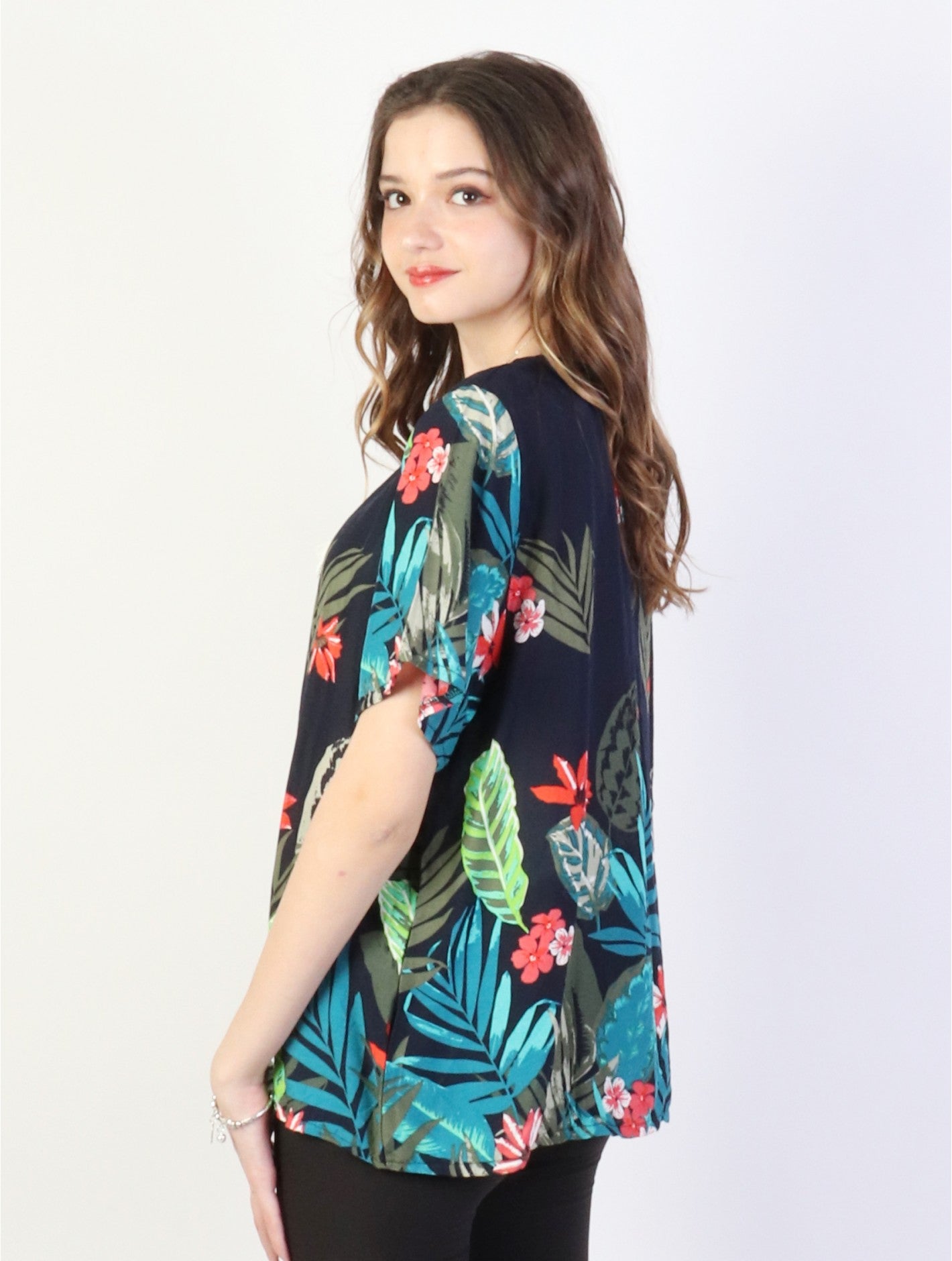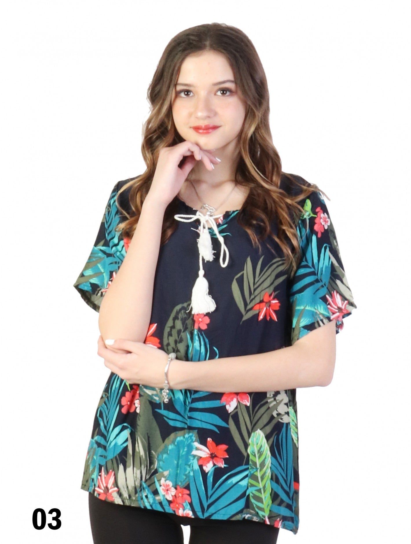 Short sleeve top with a tropical fashion print great for vacation vibes. Designed with a lightweight and cooling fabric, it is gentle on the skin and ideal for warm weather like spring or summer. Features adjustable neckline ties that can be tightened or loosened to your preference. Start your vacation with a paradise outfit!