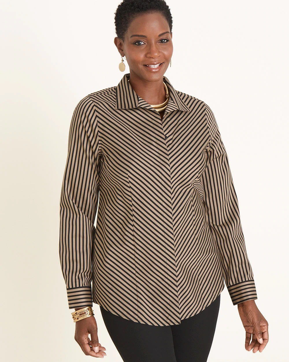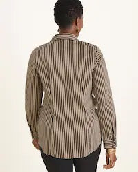 With a beautiful winged collar and soft sateen finish, this shirt goes above and beyond when it comes to easy-chic style. In a sophisticated striped print with long sleeves and a concealed button closure, you'll love that you can throw it on, skip the ironing—and feel fabulous all day.