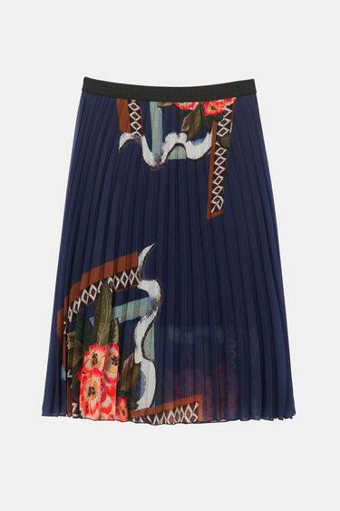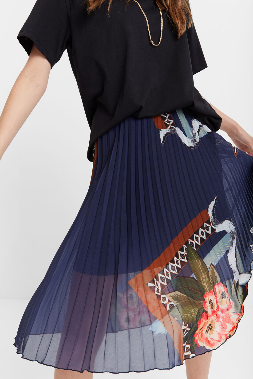 The play between a flowing and vaporous pleated semitransparent skirt and another shorter skirt that is glimpsed under it is a classic among the classics that, in this case, receives an elegant variation in the form of elegant floral prints with an arty touch.