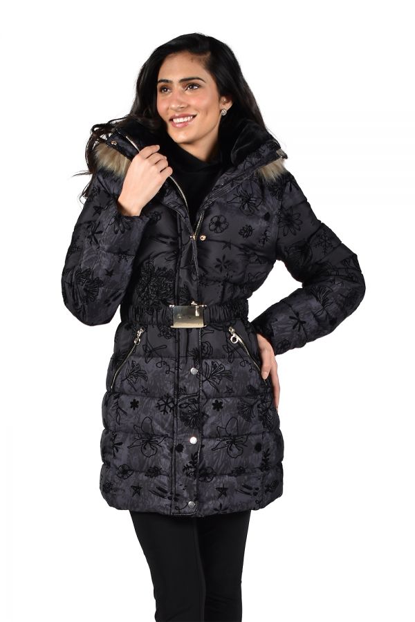 Frank Lyman 213171U Hooded Puffer In Flocked Floral Print – Black