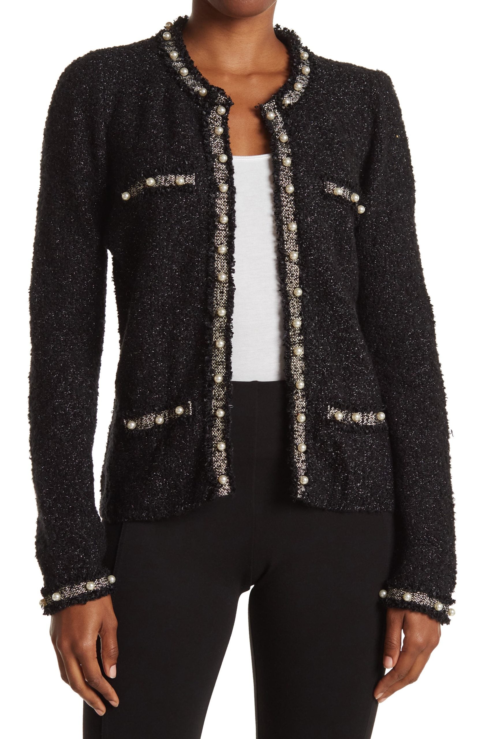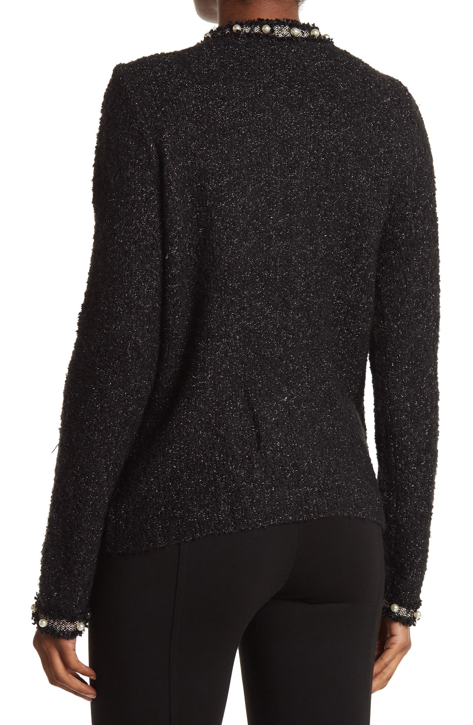 A polished faux pearl trim completes this chic glitter knit cardigan, a glamorous addition to any look!