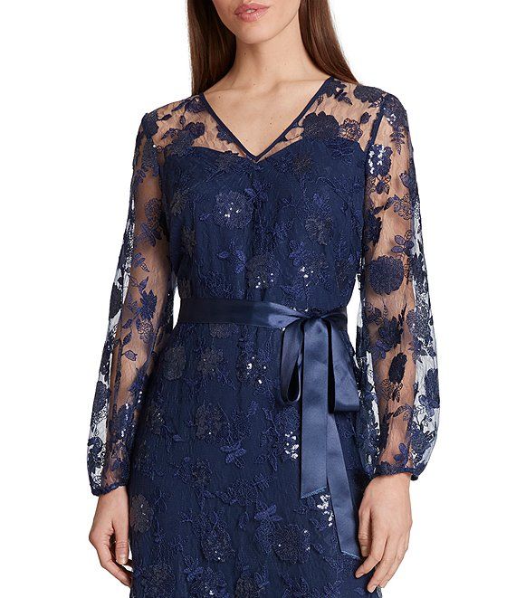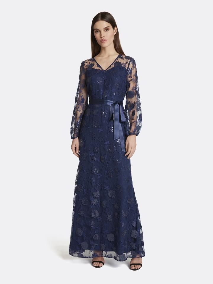 Tahari Navy Blue Satin with Lace Overlay Long Gown