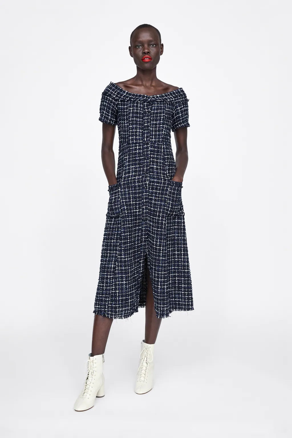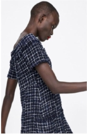 Zara Blue Tweed Midi Dress with a straight neckline, short sleeves, front patch pockets and piping, a frayed hem and rhinestone Front buttons closure.