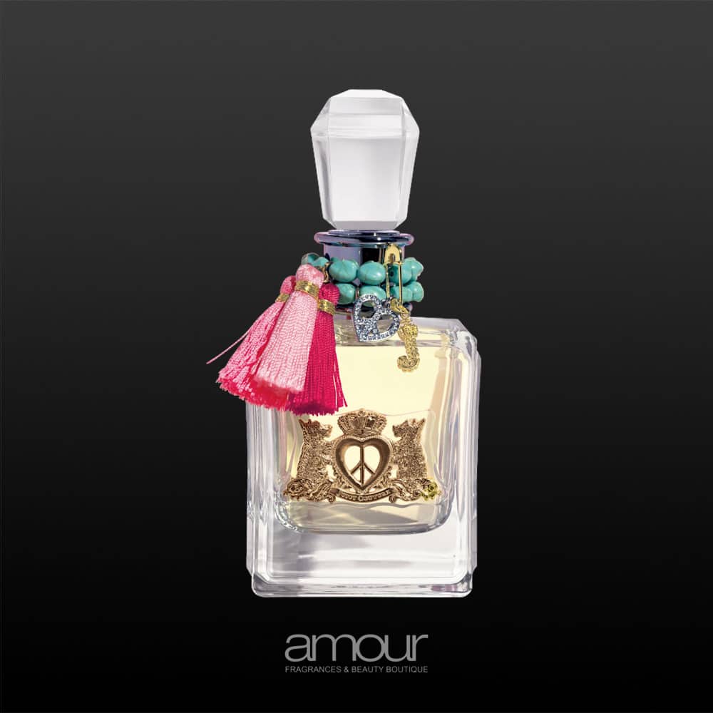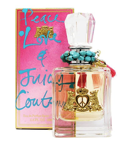 Peace Love and Juicy Couture is a floral-fruity aroma fragrance for women. The top notes are red apple, cassis, amalfi lemon and hyacinth. The middle notes are lime blossom, honeysuckle, red poppy, magnolia and jasmine. The base notes are orris root, patchouli and musk